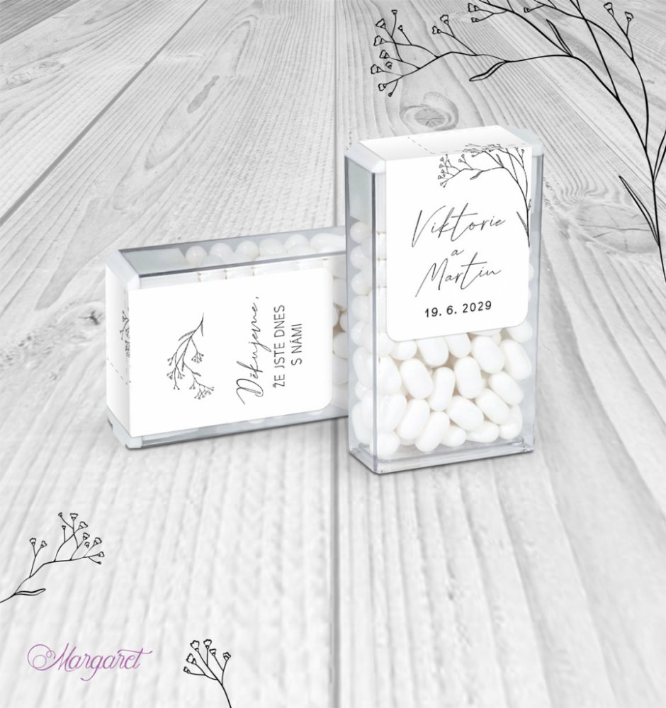 Krabička osvěžujících dražé bonbónků s etiketou ve stylu Vaší svatby, ideální na sladký bar nebo jen tak na svatební stoly.