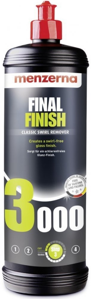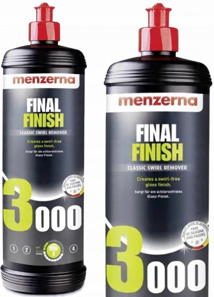 Pasta Menzerna Final Finish 3000 Menzerna Final Finish je lehká, dokončovací leštící pasta, která dodává povrchu laku vynikající lesk. Účinně odstraňuje malé vady laku, jako jsou jemné škrábance, hologramy. Odstraňuje zrnitosti 3000. Neobsahuje silikon. Minimalizace prašnosti při leštění strojem. Použití pasty Menzerna Final Finish 3000 Pro manuální použití - aplikujte výrobek na ruční lešticí podložku a vyleštěte krouživými pohyby, abyste odstranili drobné vady a dosáhli lesku. Zbývající pastu setřete utěrkou. Pro strojní použití - leštit pomocí orbitálního nebo rotačního stroje a leštících kotoučů s odpovídající tvrdostí. Optimální rychlost otáčení rotačních leštiček je v rozmezí 1200 až 2000 ot / min.