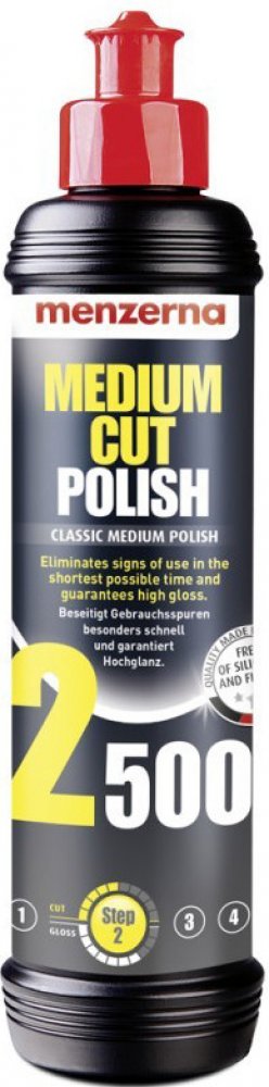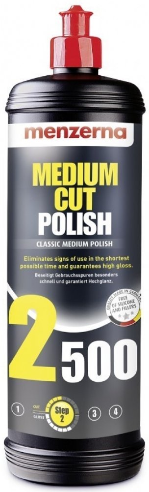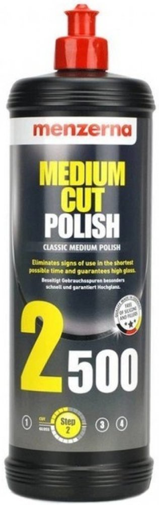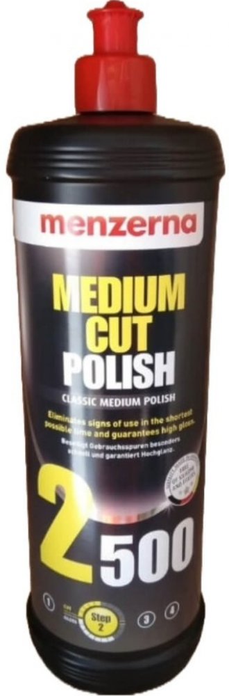 Brusná pasta Menzerna Medium Cut Polish 2500 Špičková výkonná lešticí pasta schopná snadno odstranit malé až střední vady v laku a zároveň dosáhnout finálního lesku v jednom kroku. Pasta se vyznačuje vysokou účinností i na tvrdých lacích, používaných automobilovými koncerny Daimler-Benz, BMW a VW. Odstraňuje lehké až střední škrábance způsobené automatickými myčkami. Ideální pasta pro jednokrokové leštění. Klíčové vlastnosti pasty Menzerna Medium Cut Polish 2500 Snadné použití. Nízká prašnost. Bez obsahu silikonů, bezpečná pro lakovny a následnou aplikaci keramických povlaků a vosků. Optimální rychlost otáček je v rozmezí 1200 až 2000 ot / min.