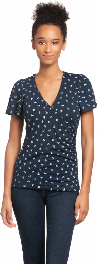 Popis: Mer Ahoy - Okouzlující sladké tričko Vive Maria je vyrobeno z příjemného viskózového materiálu s elastanem. Má přiléhavý střih a krátké rukávy, které volně padají na ruce. Tričko má zavinovací vzhled, takže pravá strana překrývá a zakrývá malé problémové partie s drobnými záhyby. Výstřih do V je obšit copánkem. Potisk obsahuje malé kotvy obsahující písmena „VM“ na modré látce.