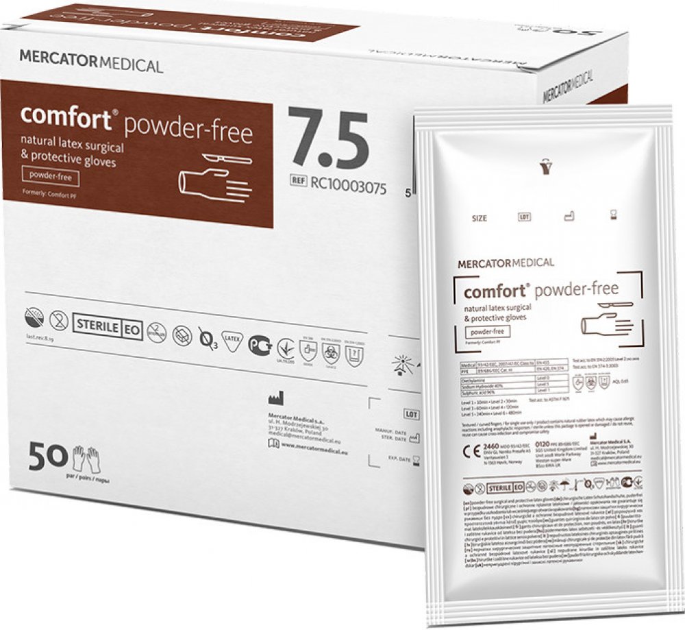 Mercator Comfort Powdered-Free jsou chirurgické rukavice určené pro obecné výkony, vyrobené z přírodního latexu, nepudrované. Elastický materiál zajišťuje dobré přizpůsobení ruce a nejvyšší komfort při práci.
