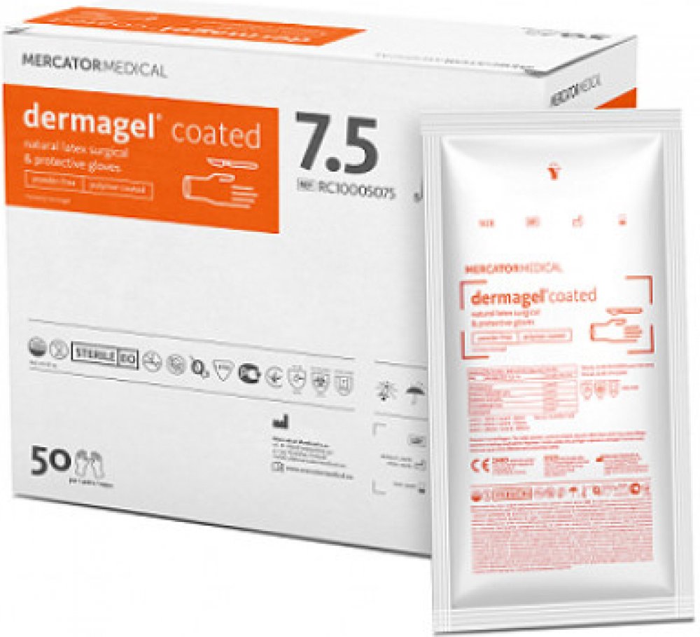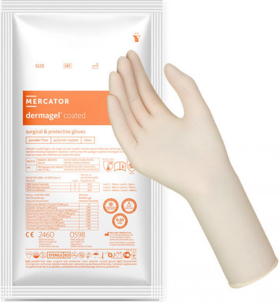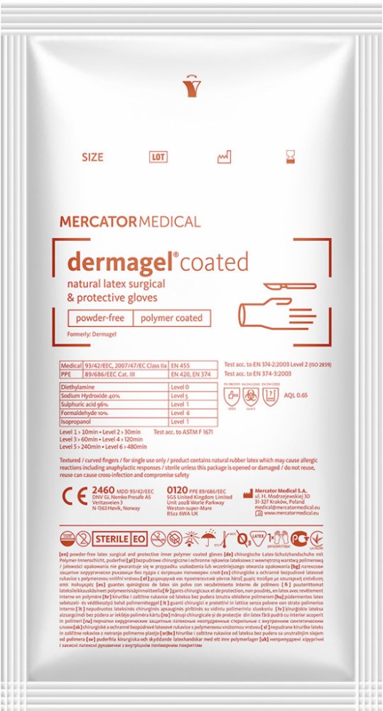Mercator Dermagel Coated jsou chirurgické rukavice určené pro obecné výkony, vyrobené z přírodního latexu, potažené polymerem, nepudrované. Jedná se o pružné rukavice odolné proti roztržení, které zajišťují dokonalý úchop. Vnitřní polymerová vrstva umožňuje snadné nasazení na suché a vlhké ruce.