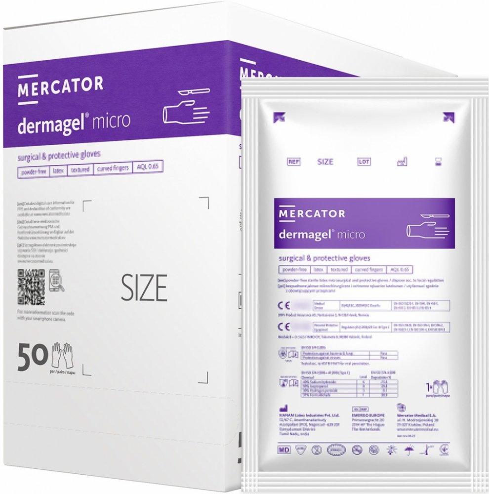 Mercator Dermagel Micro jsou chirurgické rukavice určené pro precizní výkony, vyrobené z přírodního latexu, nepudrované. Rukavice zajišťují maximální cit a dotykovou citlivost, a to i v případě mikrochirurgických výkonů. Hnědá barva rukavic redukuje odrazy světla chirurgických svítidel.