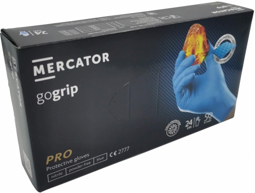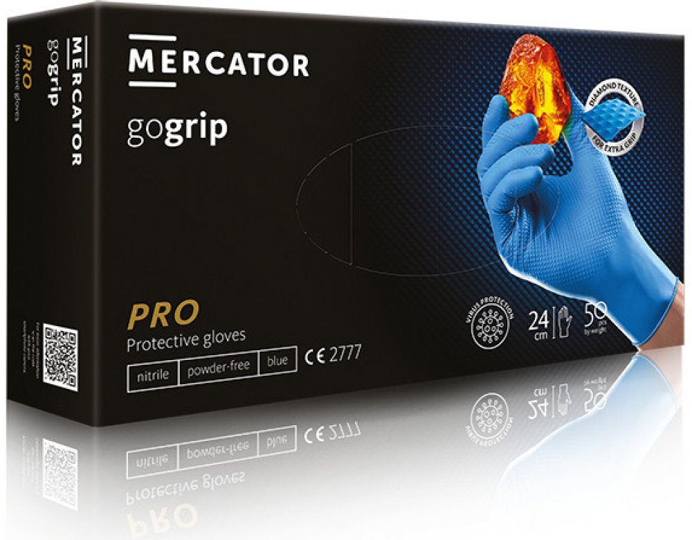 Rukavice ochranné nitrilové bezprašné GOGRIP jsou nesterilní, velmi pevné, s rolovaným okrajem, doporučené pro jednorázové použití. Výrazná textura ve tvaru diamantu zaručuje spolehlivý úchop předmětů i při práci s mazivy, tuky nebo ve vlhkém prostředí. Jsou silnější než standardně dostupné nitrilové rukavice. Materiál nedovolí proniknout bakteriím ani plísním. Výrobek je zařazen do kategorie III B. Vynikající mechanická odolnost, ideální v olejnatých prostředích. Délka cca 24 cm.Velikosti: M, L a XL. Barva modrá. Balení 50 kusů. Cena uvedena za balení.Doporučené použitíAutomobilový a strojírenský průmysl, veškeré konstrukční a montážní práce, ve stavebnictví, mechanizaci, potravinářství, při úklidových pracích, vhodné pro elektrikáře, instalatéry, údržbáře, zámečníky a truhláře, pracovníky komunálního hospodářství, technických a provozních oddělení.Pokyny k použitíRukavice se nasazují na suché a čisté ruce. Manžetu umístěte přes oděv, abyste předešli proniknutí kapaliny či jiné používané látky. Rukavice jsou určeny převážně pro jednorázové použití. Při sundávání rukavic se nedotýkejte jejich vnější strany, přehněte konec manžety a stáhněte je otočením naruby.Pokyny ke skladováníRukavice skladujte v jejich originálním obalu, chraňte před přímým sluncem, v dostatečné vzdálenosti od zdrojů tepla.