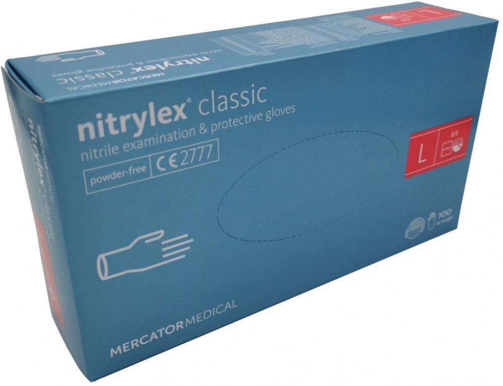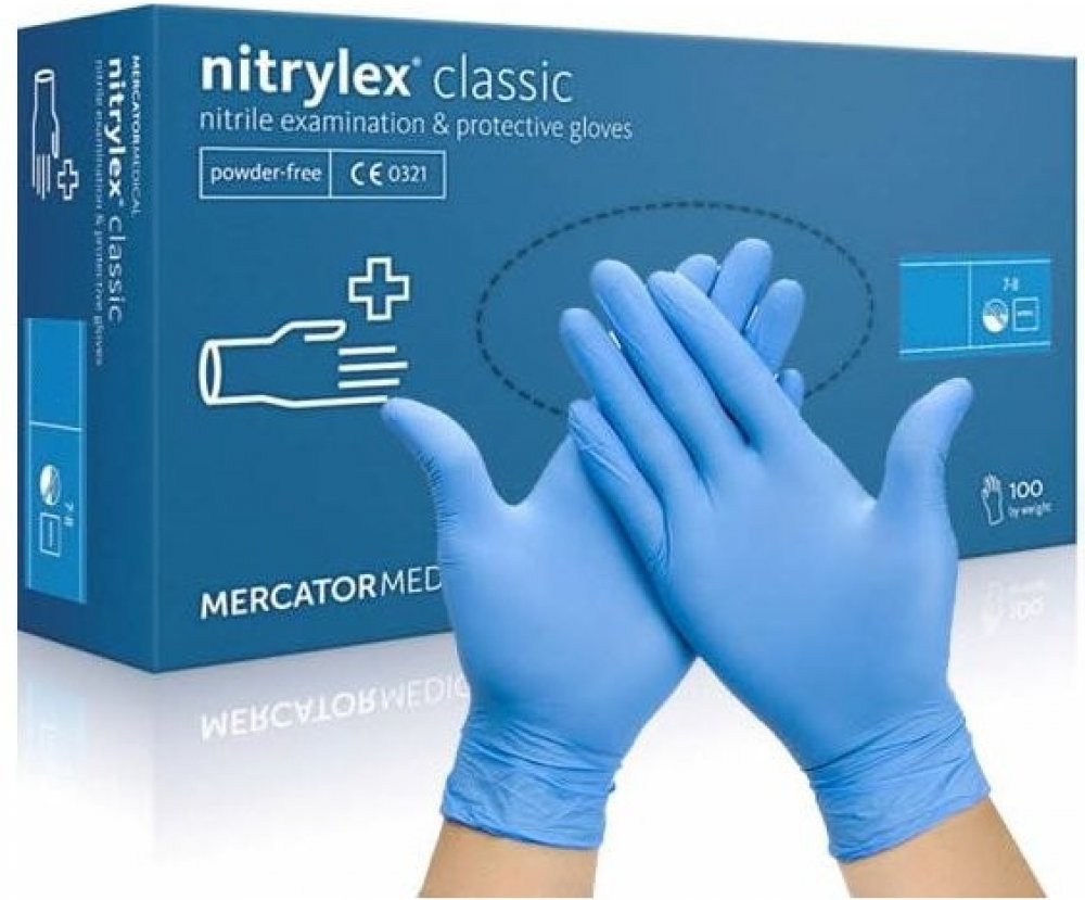 Nitrilové jednorázové ochranné rukavice NITRYLEX PF Classic jsou bez pudru, nesterilní. Mají rolovaný okraj, který zachytí možné tekoucí kapky. Rukavice NITRYLEX PF Classic sedí na ruce jako druhá kůže. Texturovaný povrch navíc poskytuje vynikající cit doteku a spolehlivý úchop předmětů. Nitrilové rukavice se vyznačují nejlepší mechanickou a chemickou odolností, jsou hypoalergenní (nezpůsobují alergické reakce). Vhodné pro styk s potravinami. AQL 1.0. CAT III. Délka 24 cm.Velikosti: S, M, L a XL. Barva modrá. Balení 100 kusů. Cena uvedena za balení.Doporučené použitíZdravotnictví, potravinářský průmysl, laboratoř (např. výroba léčiv, příprava léčiv, výzkum), stomatologie, veterinářství, kosmetický průmysl, elektronický a polygrafický průmysl.Pokyny k použitíNasazují se na suché a čisté ruce. Manžetu umístěte přes oděv, abyste předešli proniknutí kapaliny. Rukavice jsou určeny pouze pro jednorázové použití. Při sundávání rukavic se nedotýkejte jejich vnější strany, přehněte konec manžety a stáhněte je otočením naruby.Pokyny ke skladováníRukavice skladujte v jejich originálním obalu, chraňte před přímým sluncem, v dostatečné vzdálenosti od zdrojů tepla.