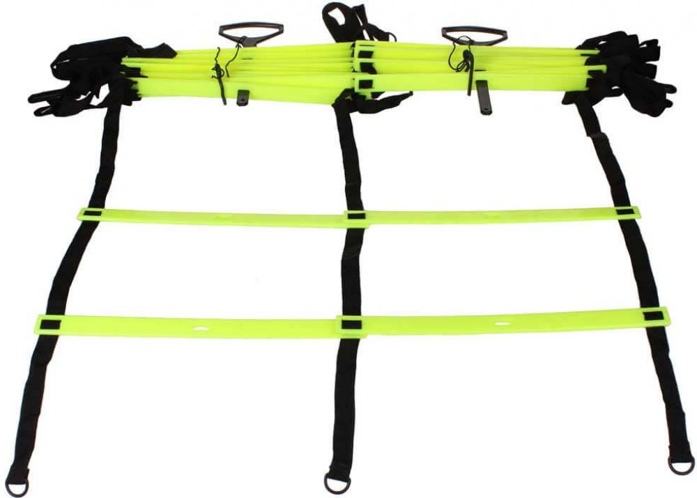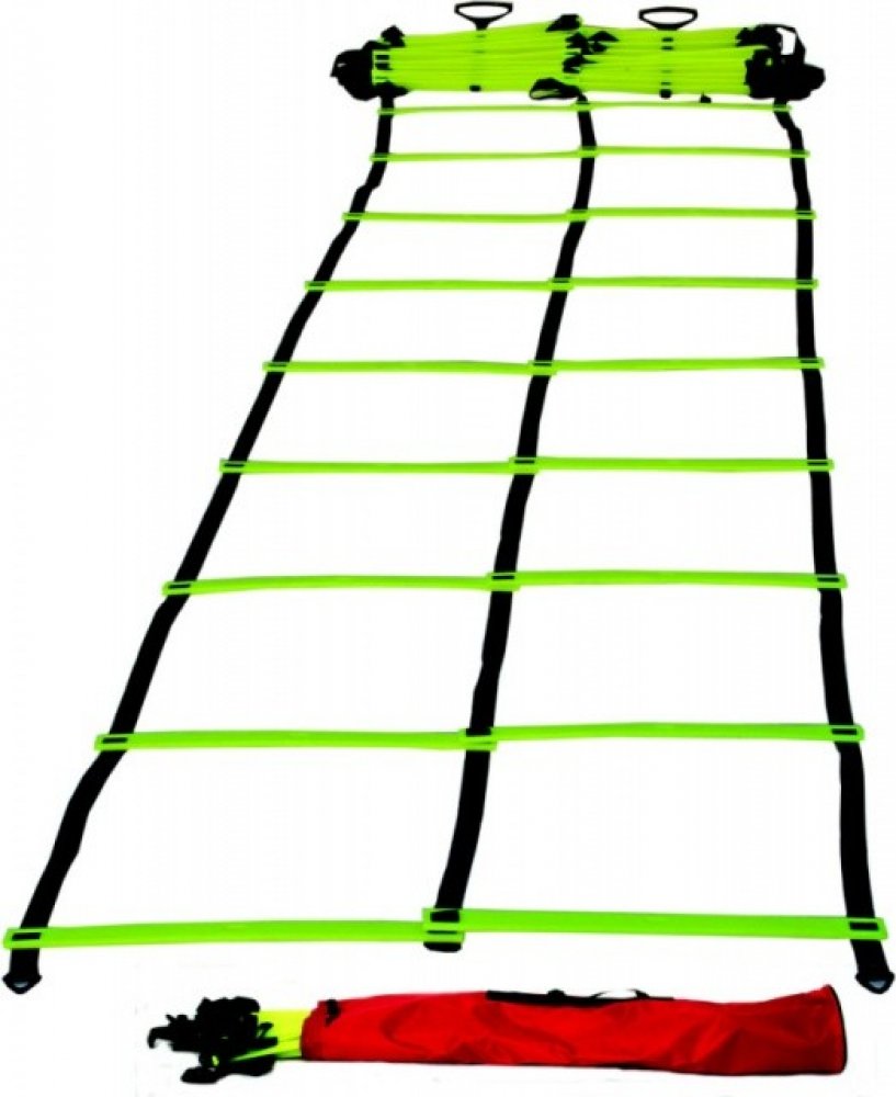 Dvojitý agility žebřík pro kondiční přípravu sportovců. Plastové příčky žebříku jsou snadno nastavitelné pro přizbůsobení vzdálenosti mezi jednotlivými příčkami podle potřeb uživatele. Unikátním vylepšením jsou madla, která je možné protáhnout středy obou žebříků. Madla pak slouží nejen jako nosič, ale zabraňují i zamotání žebříků. Agility žebřík 9 m lze pomocí suchého zipu rozdělit na dva kusy 4,...