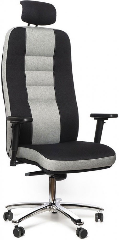 Křeslo s extra vysokým opěradlem a stavitelnou opěrkou hlavy. Opěradlo kopíruje tvar páteře uživatele. Opěrka hlavy poskytuje komfortní oporu hlavy, nastavitelná do výšky a úhlu. Samotná výška zádové opěrky včetně opěrky hlavy je 101 cm (měřeno s opěrkou hlavy v nejnižší poloze). Proto tohle křeslo doporučujeme pro výšku postavy od 190 do 220 cm.
