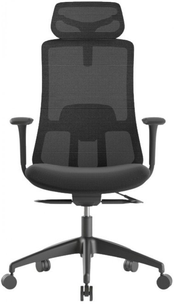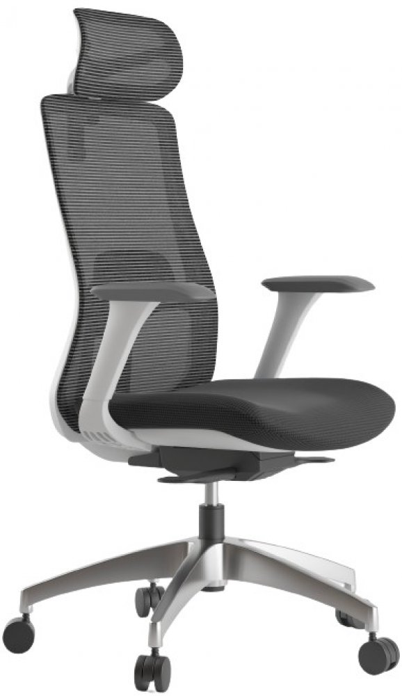 Síťovaný opěrák a podhlavník, látkový sedák, plastový rám a područky, stabilní hliníkový kříž.