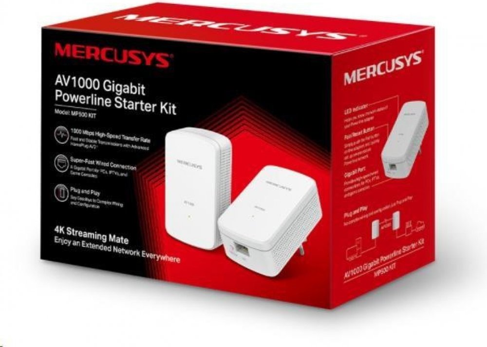 Mercusys MP500 AV1000 Gigabit Powerline Starter Kit. Sada MP500 přenáší síťová data prostřednictvím stávajících elektrických obvodů a vyhýbá se negativním vlivům překážek v síti. Užijte si stabilní rozšířenou síť s přenosovou vzdáleností až 300 metrů (na stejném elektrickém obvodu). Perfektní pro streamování 4K, online hry a aplikace náročné na grafiku.