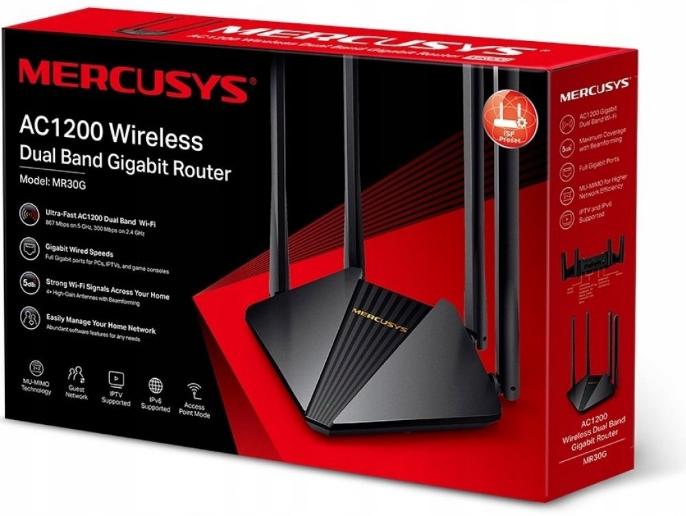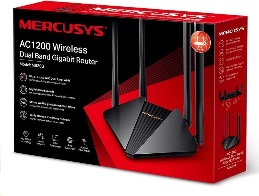 - Patch kabelMercusys MR30G je moderní designový router s 4 fixními anténami se ziskem 5dBi, dvěmi Gigabitovými LAN a jedním Gigabitovým WAN portem. V bezdrátové části jsou 2 rádia, která jsou obě 2x2 MIMO, podporují MU-MIMO a mají modulační rychlosti 300 Mbps (2.4GHz) a 866 Mbps (5GHz). Co do softwarové výbavy, router kromě standardního režimu AP Router podporuje i mód Access Point. Router má plnou podporu nejnovějšího routovacího protokolu IPv6.