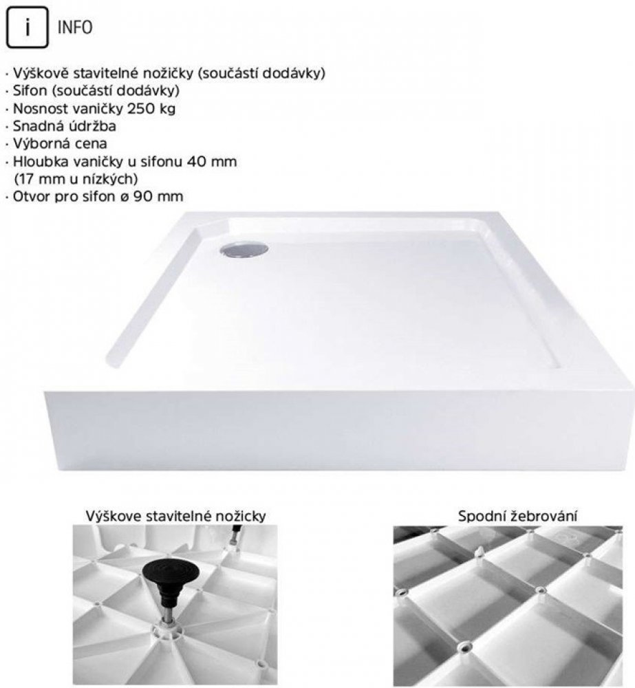 Vanička je určená pro použití do rohu. Její dvě boční strany jsou pohledové a dvě jsou s výřezem, pro pohodlnější montáž (např. v kombinaci se sprchovým boxem).