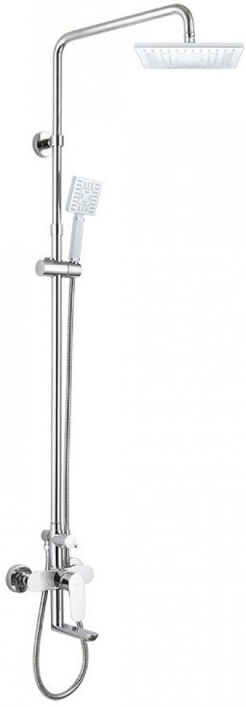 Vanová baterie s ramínkem a integrovaným přepínačem, ruční sprchou a horní talířovou sprchou. Ramínko baterie je otočné. Baterie dodáváme s roztečí 150 mm a dvouzámkovou nerezovou připojovací hadicí o délce 150 cm.