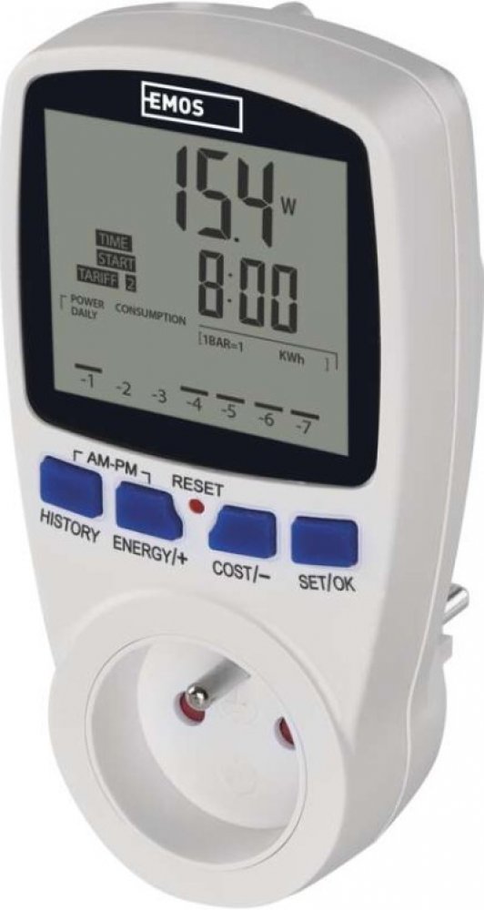 bezdrátové: ne|dětské clonky: ano|LED indikace přetížení: ano|max. zátěž: 3 680 W|max. zaznamenaný čas: 9 999 hodin|napětí/proud: 230 V~/16 A max.|prodejní obal: 1 ks, krabice|produkt: měřič spotřeby elektrické energie|rozměr: 148 × 75 × 75 mm|rozsah měření: 2 W–3 680 W|rozsah spotřeby elektrické energie: 0 kWh–9 999 kWh|záložní akumulátor: 2× 1.5 V (LR44/AG13)