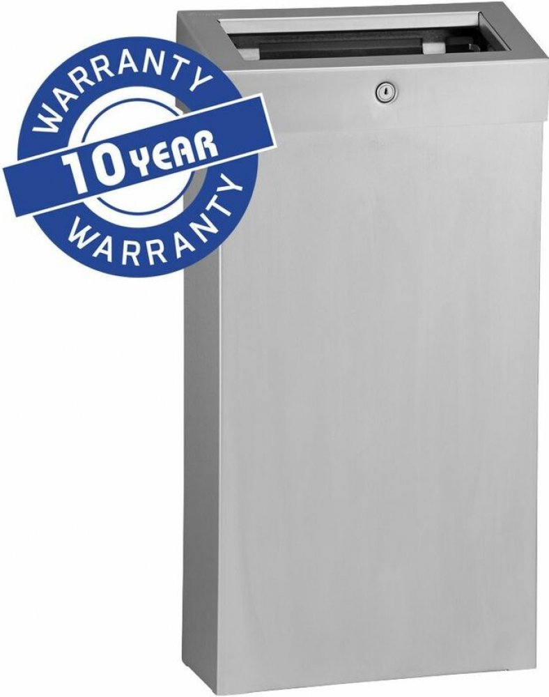 objem 15 litrů koš tvaru SLIM má sníženou hloubku opatřeno odnímatelným krytem s otvorem opatřeno vnitřním rámem pro uchycení odpadního pytle/sáčku možnost montáže na stěnu vyrobeno z broušené (matné) nerezové oceli uzavřeno odolným ocelovým cylindrickým zámkem, v jedné rovině s povrchem zařízení boční spoje svařené a leštěné neviditelné panty 10 let záruka Udržení záruky vyžaduje dodržování pravi...