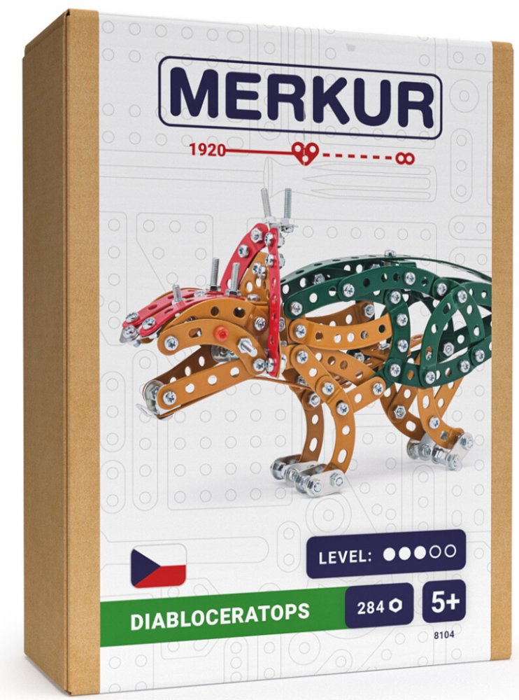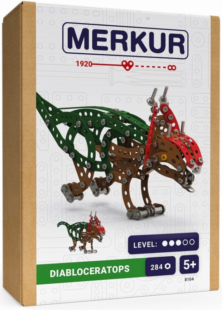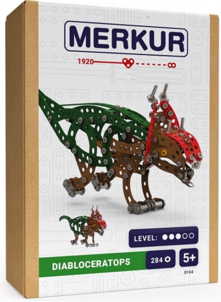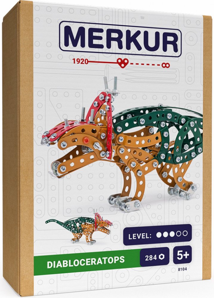 Dinosaururs Diabloceratops byl mohutný čtyřnohý býložravec s relativně velkou hlavou a dlouhým krčním límcem, zdobeným výraznými rohy. Právě těm vděčí diabloceratops za své jméno, propůjčují jeho lebce ďábelský zjev. Kovový model dinosaura Diabloceratops Merkur obsahuje součástky nutné pro stavbu dinosaura. V balení najdete podrobný návod, Merkur sadu nářadí a unikátní Merkur díly. Merkur díly jsou univerzální a tak vás neomezí v jakékoli modifikaci a nápadu. Stavebnici tak můžete sestavit podle přiloženého návodu nebo čistě podle svých představ. Se sestavenými modely si lze hrát, jsou velmi odolné. Podporuje a rozvíjí manuálních schopnosti, logické myšlení, soustředění.