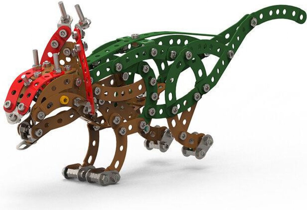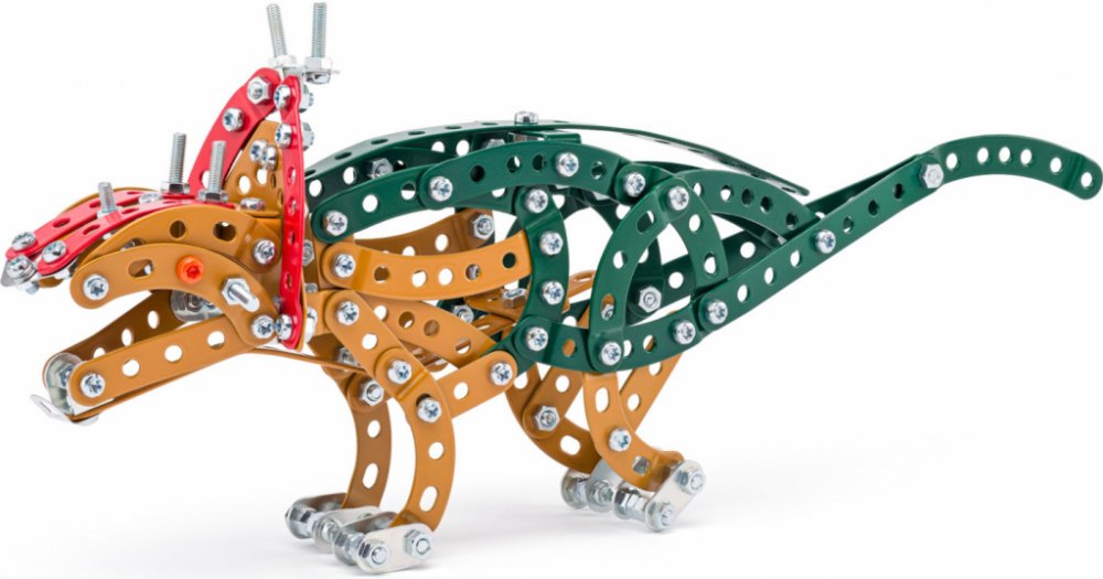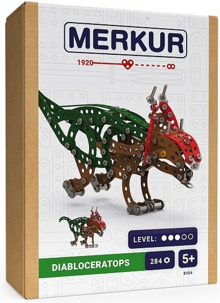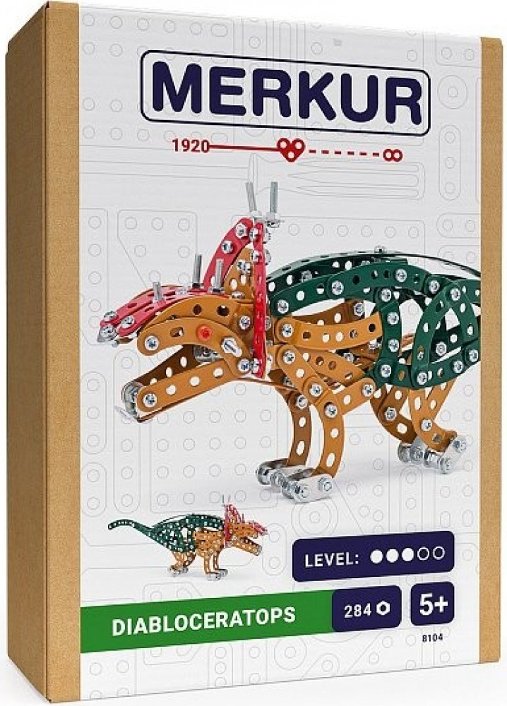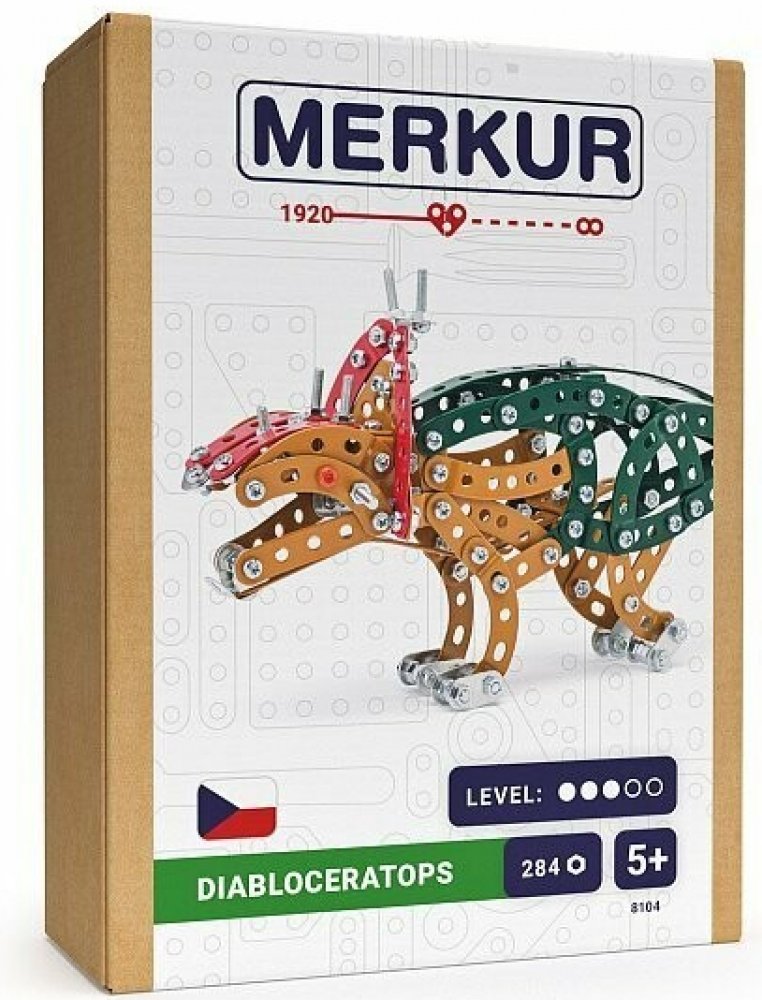 Dinosaururs Diabloceratops byl mohutný čtyřnohý býložravec s relativně velkou hlavou a dlouhým krčním límcem, zdobeným výraznými rohy. Právě těm vděčí diabloceratops za své jméno, propůjčují jeho lebce ďábelský zjev. Kovový model dinosaura Diabloceratops Merkur obsahuje součástky nutné pro stavbu dinosaura. V balení najdete podrobný návod, Merkur sadu nářadí a unikátní Merkur díly. Merkur díly jsou univerzální a tak vás neomezí v jakékoli modifikaci a nápadu. Stavebnici tak můžete sestavit podle přiloženého návodu nebo čistě podle svých představ. Se sestavenými modely si lze hrát, jsou velmi odolné. Podporuje a rozvíjí manuálních schopnosti, logické myšlení, soustředění.