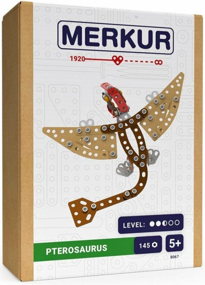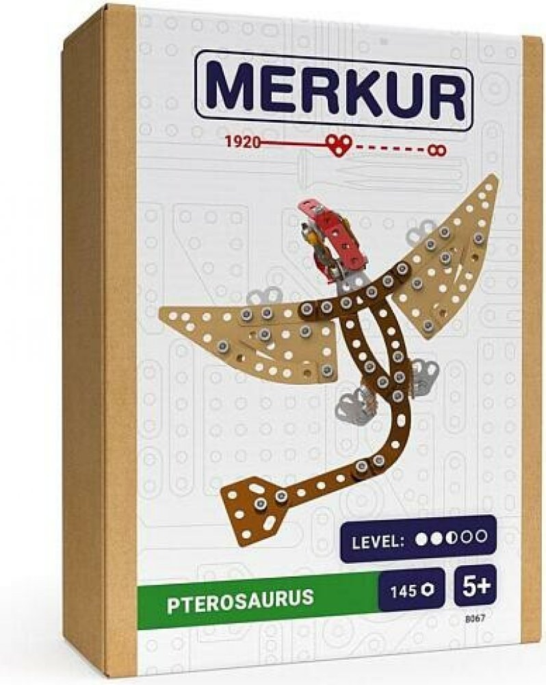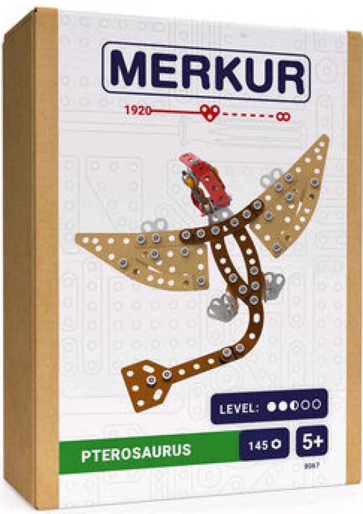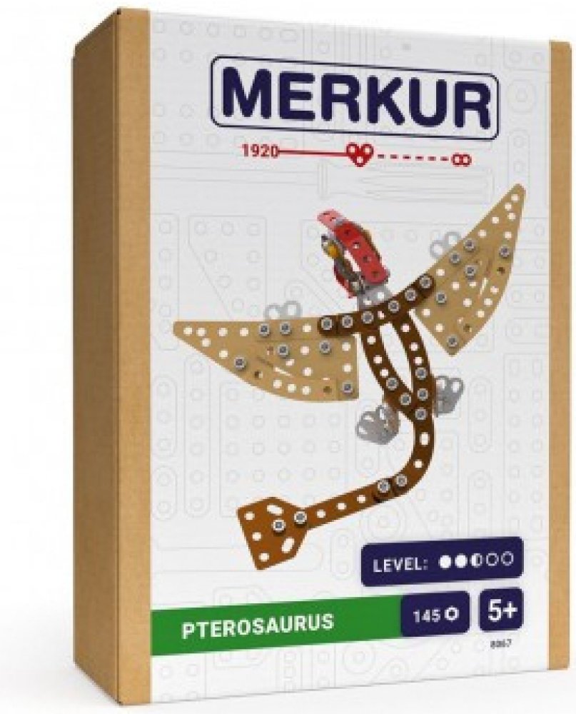 Kovová stavebnice obsahuje součástky nutné pro stavbu dinosaura. V balení najdete podrobný návod, sadu nářadí a unikátní Merkur díly. Merkur díly jsou univerzální a tak vás neomezí v jakékoli modifikaci a nápadu. Stavebnici tak můžete sestavit podle přiloženého návodu nebo čistě podle svých představ. Se sestavenými modely si lze hrát, jsou velmi odolné. Podporuje a rozvíjí manuálních schopnosti, logické myšlení, soustředění. Stavebnice je vhodná pro děti od 5 let.