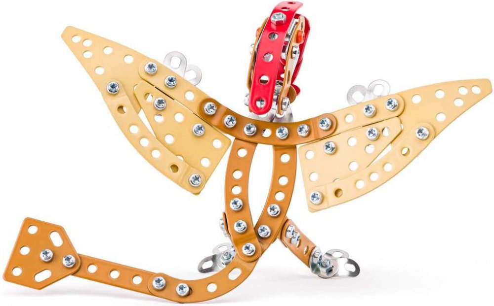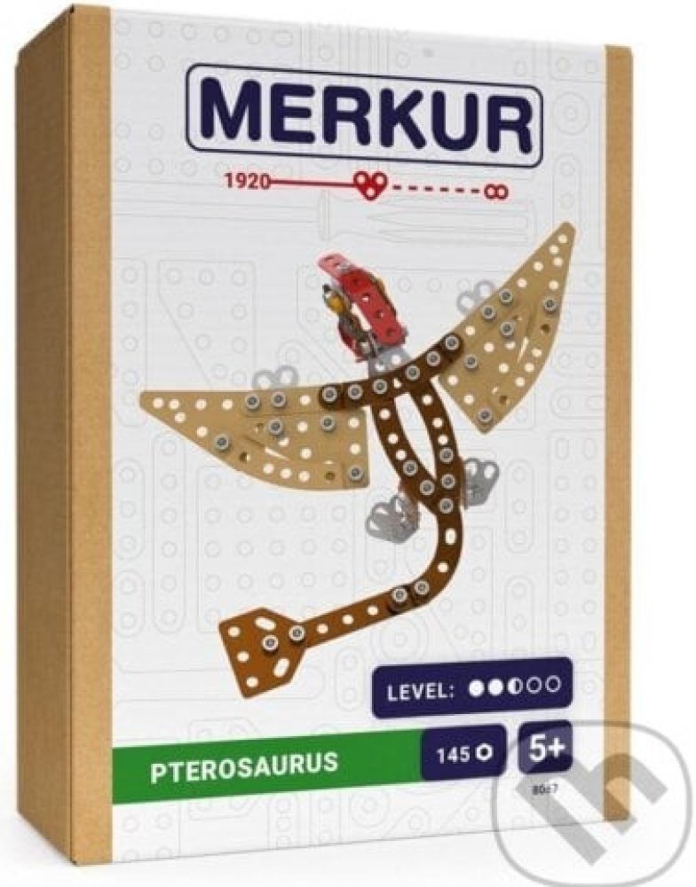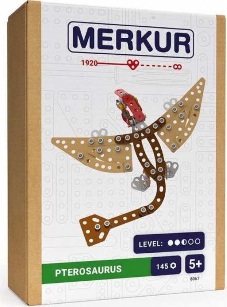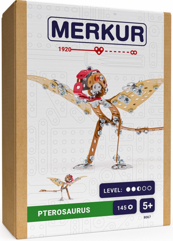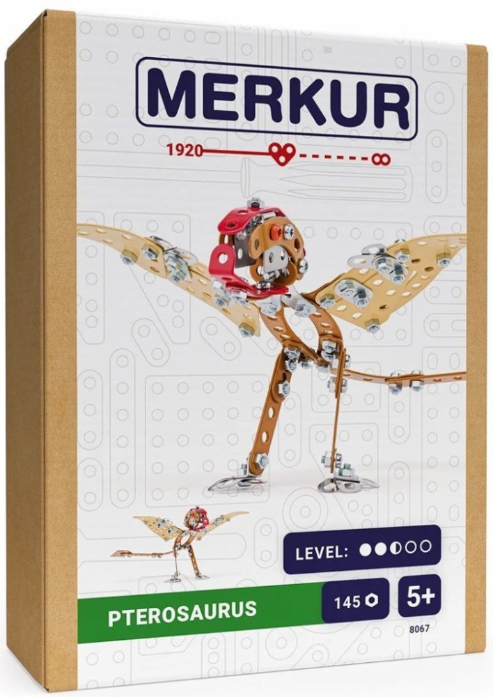 Kovová stavebnice obsahuje součástky nutné pro stavbu dinosaura. V balení najdete podrobný návod, sadu nářadí a unikátní Merkur díly. Merkur díly jsou univerzální a tak vás neomezí v jakékoli modifikaci a nápadu. Stavebnici tak můžete sestavit podle přiloženého návodu nebo čistě podle svých představ. Se sestavenými modely si lze hrát, jsou velmi odolné. Podporuje a rozvíjí manuálních schopnosti, logické myšlení, soustředění. Stavebnice je vhodná pro děti od 5 let.