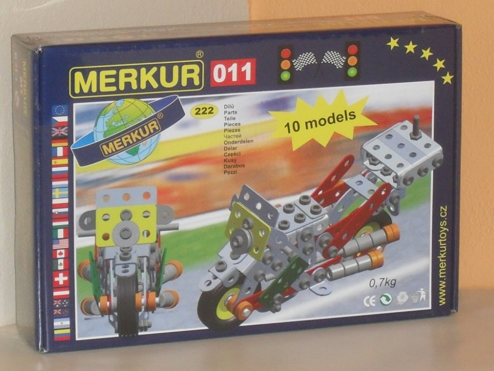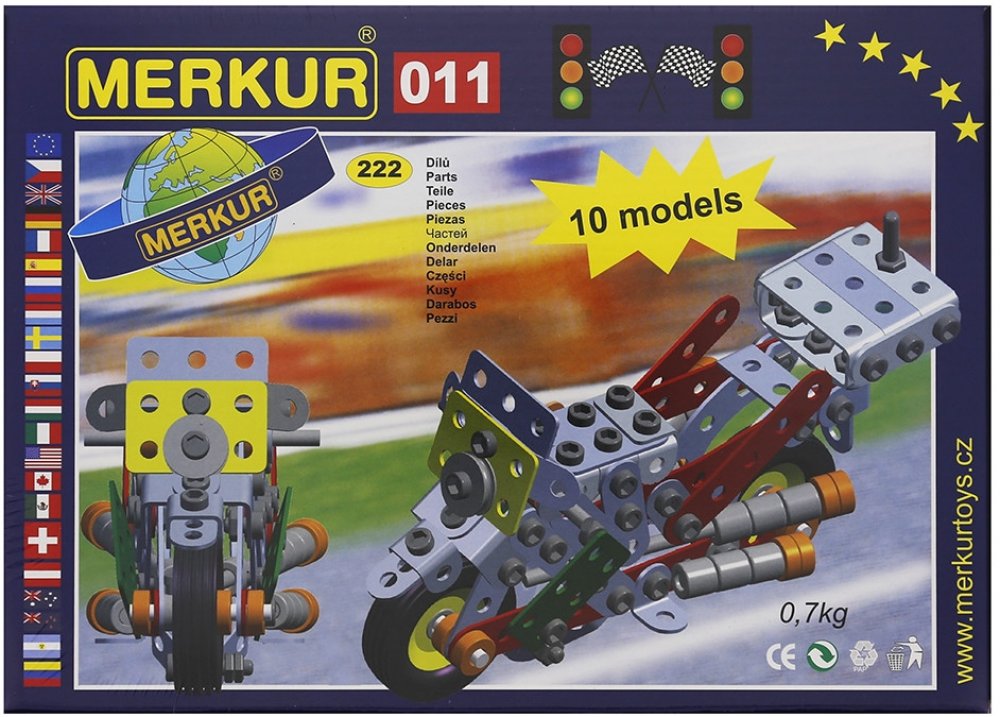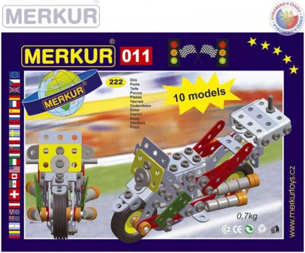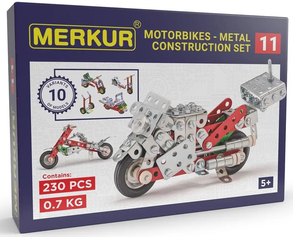 Ze stavebnice Merkur 011 Motocykl je možné dle návodu sestavit až 10 různých modelů motocyklů a jiných vozítek. Malí konstruktéři mohou sestavit i model dle svých představ, fantazii se meze nekladou. Stavebnice obsahuje 222 dílků. Vhodné i pro děti, které s Merkurem začínají. Se sestavenými modely si lze hrát, jsou velmi odolné. Rozměr balení: 26 x 18 x 5 cm. Věk: 6+. Nevhodné pro děti mladší 3 le...