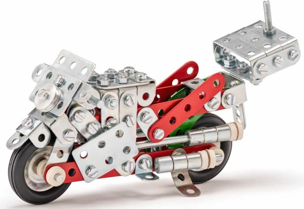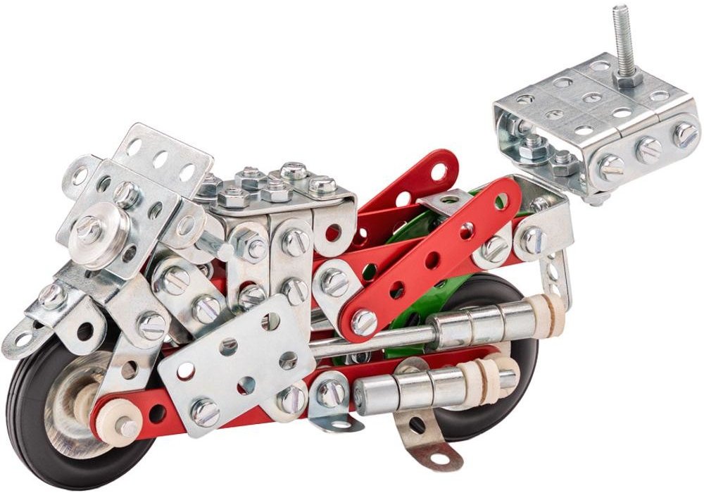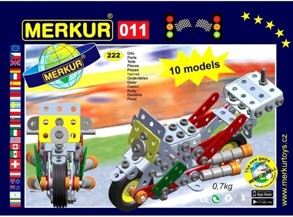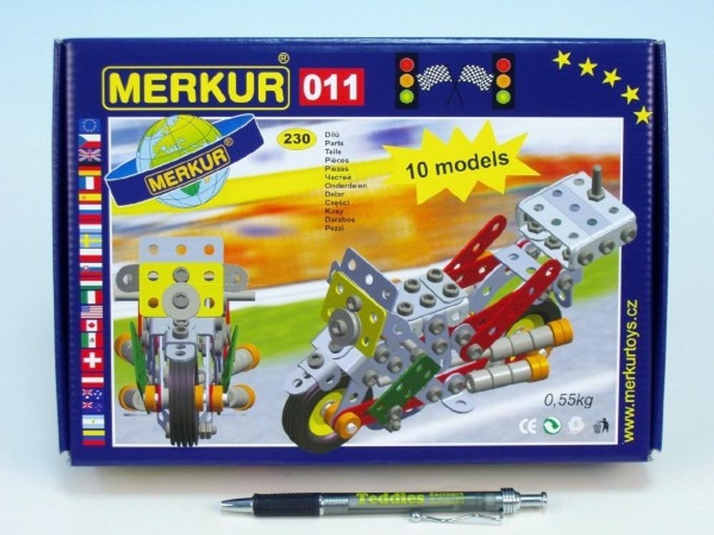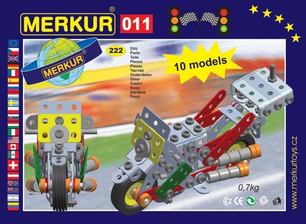 Ze stavebnice Merkur 011 Motocykl je možné dle návodu sestavit až 10 různých modelů motocyklů a jiných vozítek. Malí konstruktéři mohou sestavit i model dle svých představ, fantazii se meze nekladou. Stavebnice obsahuje 222 dílků. Vhodné i pro děti, které s Merkurem začínají. Se sestavenými modely si lze hrát, jsou velmi odolné. Rozměr balení: 26 x 18 x 5 cm. Věk: 6+. Nevhodné pro děti mladší 3 le...