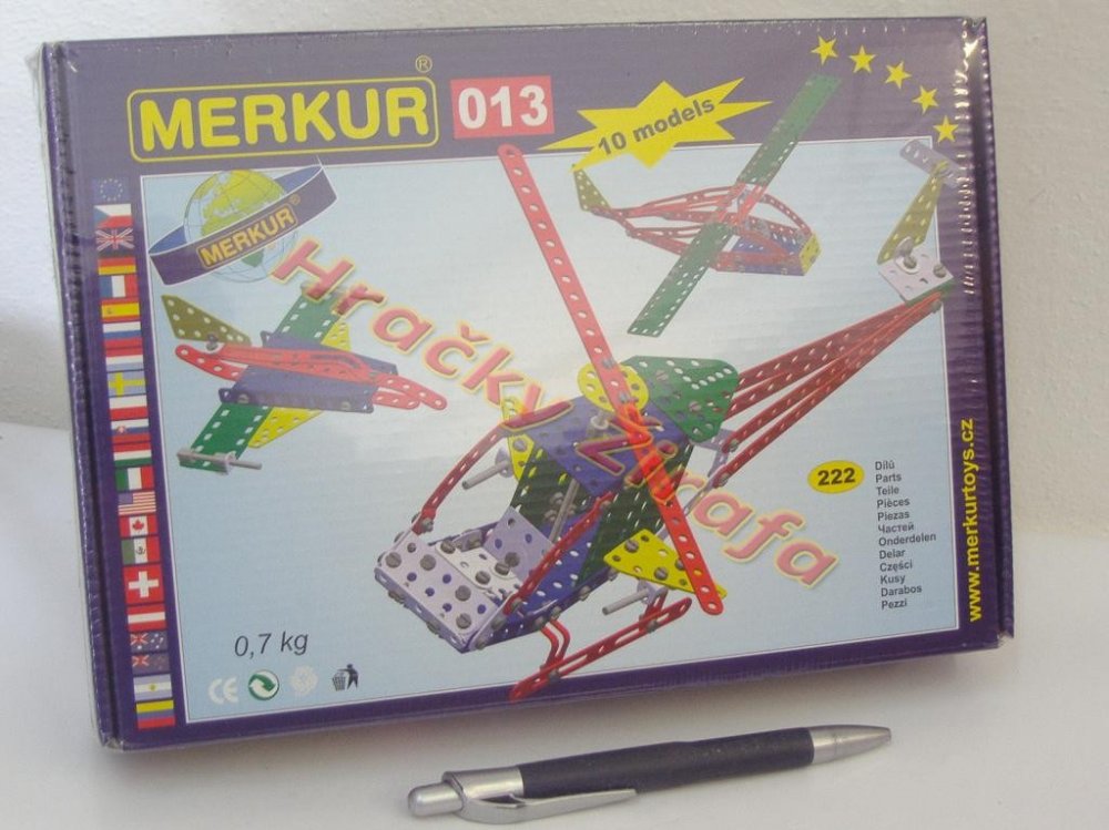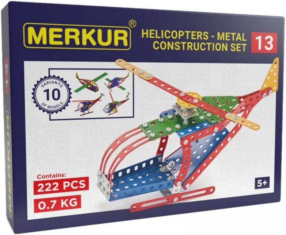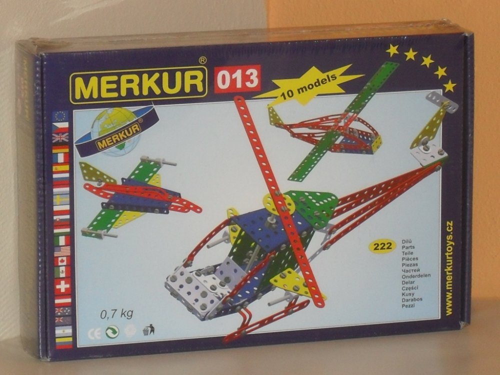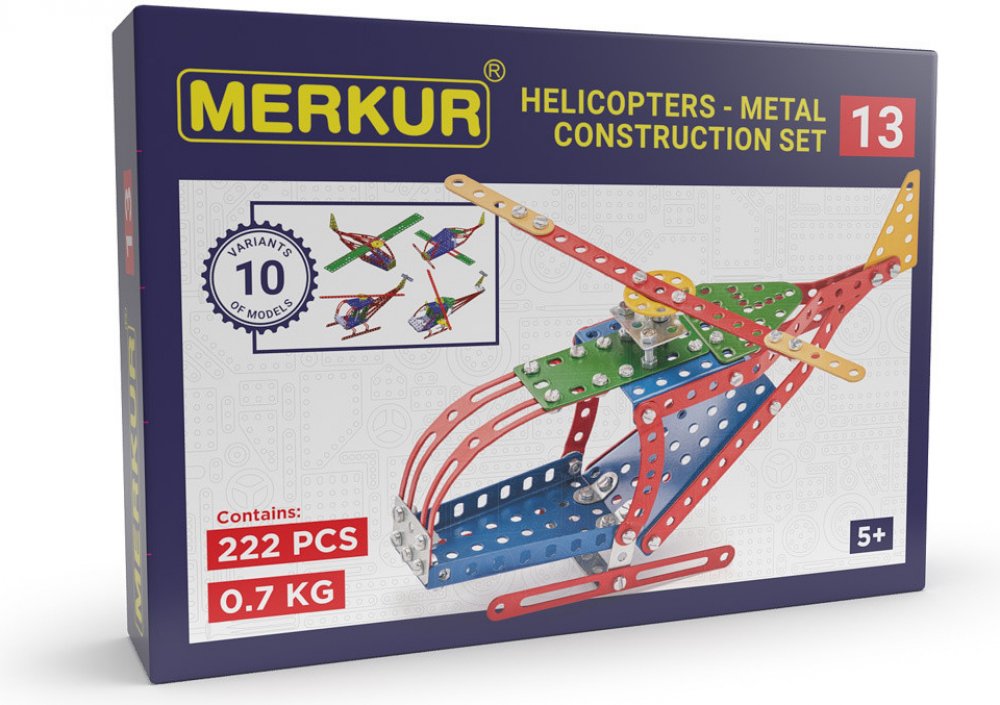 Ze stavebnice Merkur 013 Vrtulník je možné dle návodu sestavit až 10 různých modelů letecké techniky. Malí konstruktéři mohou sestavit i model dle svých představ, fantazii se meze nekladou. Stavebnice obsahuje 222 dílků. Vhodné i pro děti, které s Merkurem začínají. Se sestavenými modely si lze hrát, jsou velmi odolné. Rozměr balení: 26 x 18 x 5 cm. Věk: 6+. Nevhodné pro děti mladší 3 let.