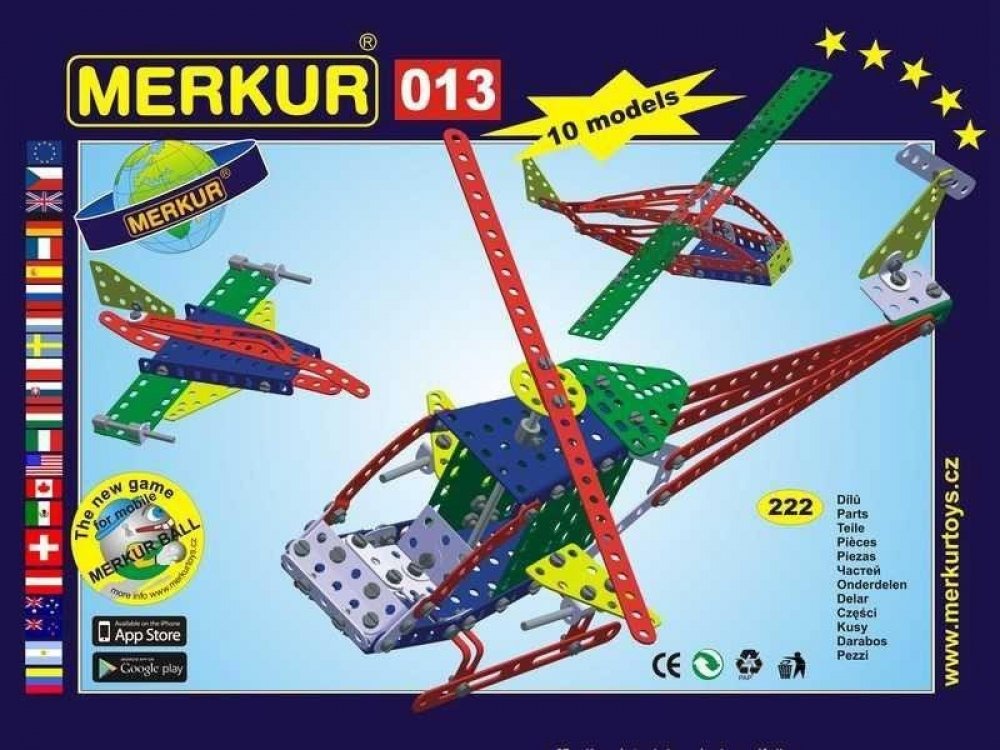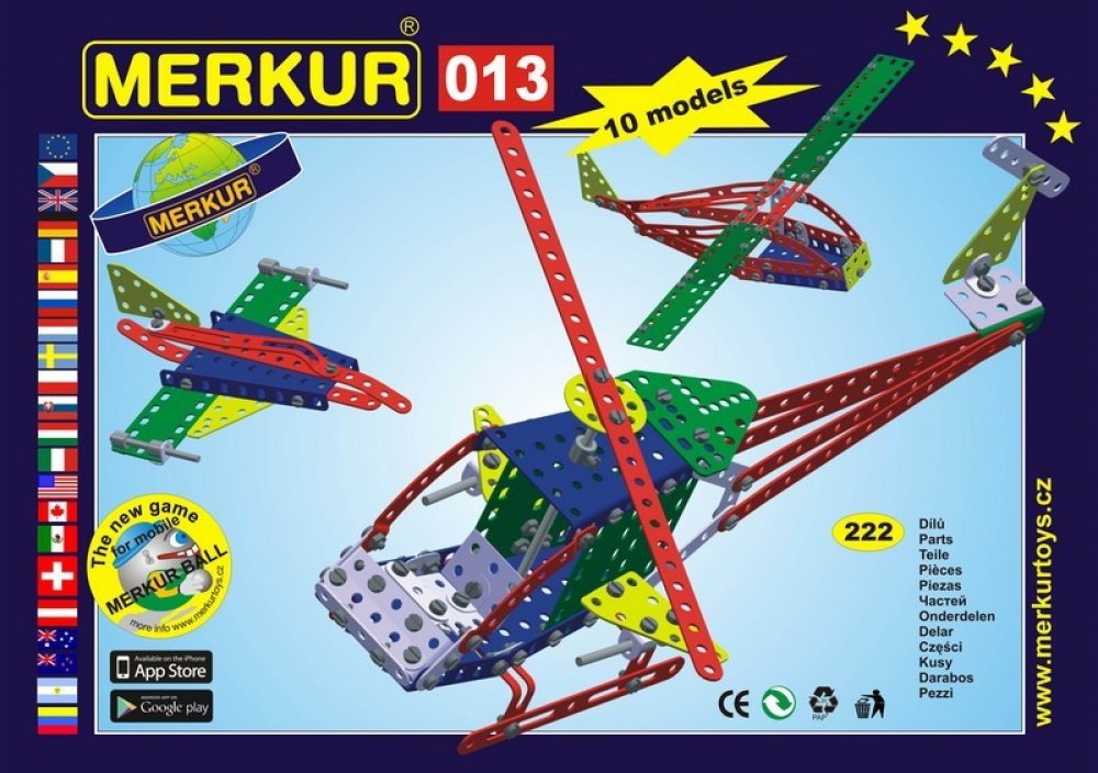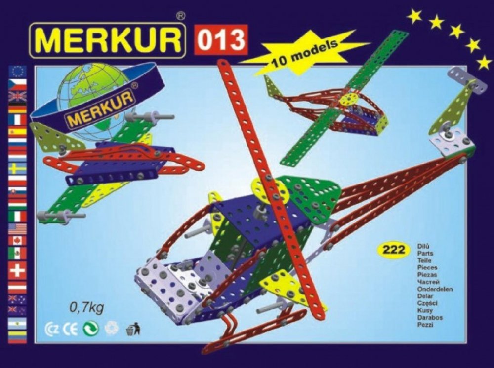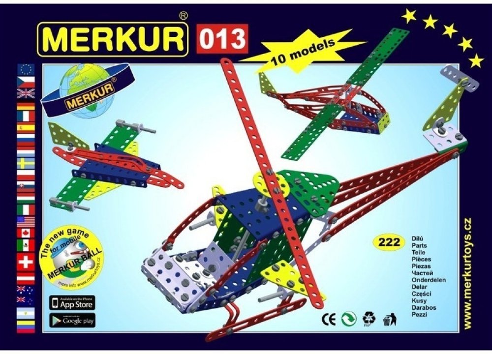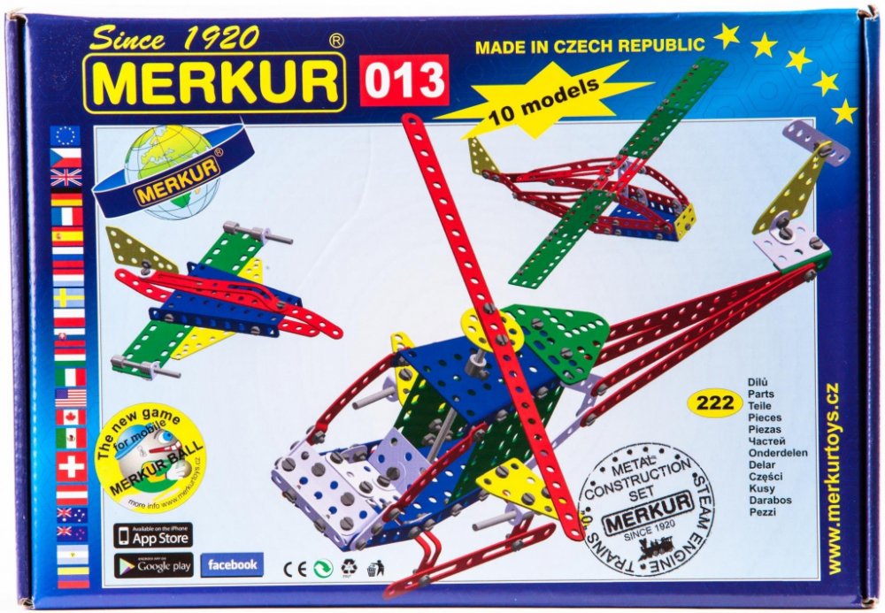 Ze stavebnice Merkur 013 Vrtulník je možné dle návodu sestavit až 10 různých modelů letecké techniky. Malí konstruktéři mohou sestavit i model dle svých představ, fantazii se meze nekladou. Stavebnice obsahuje 222 dílků. Vhodné i pro děti, které s Merkurem začínají. Se sestavenými modely si lze hrát, jsou velmi odolné. Rozměr balení: 26 x 18 x 5 cm. Věk: 6+. Nevhodné pro děti mladší 3 let.