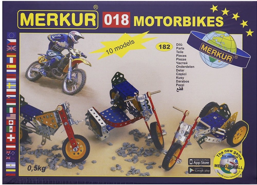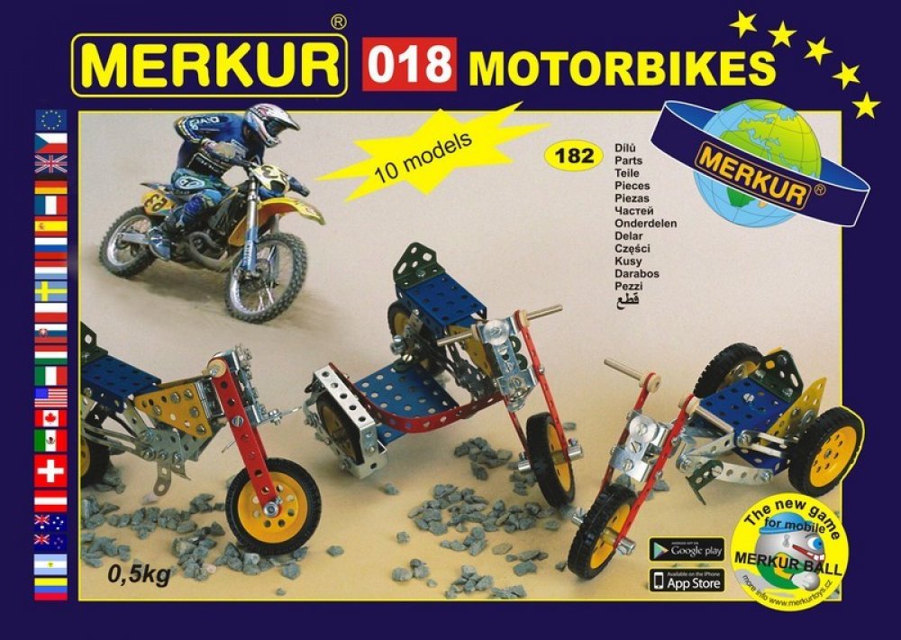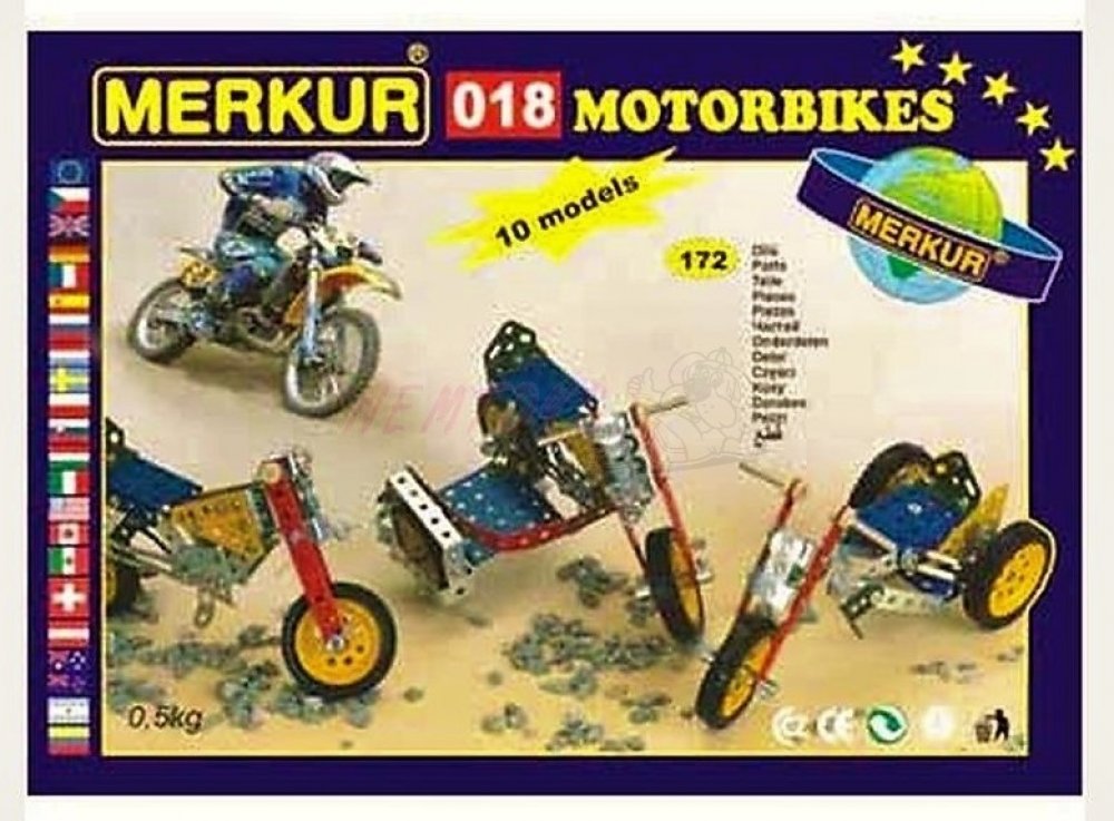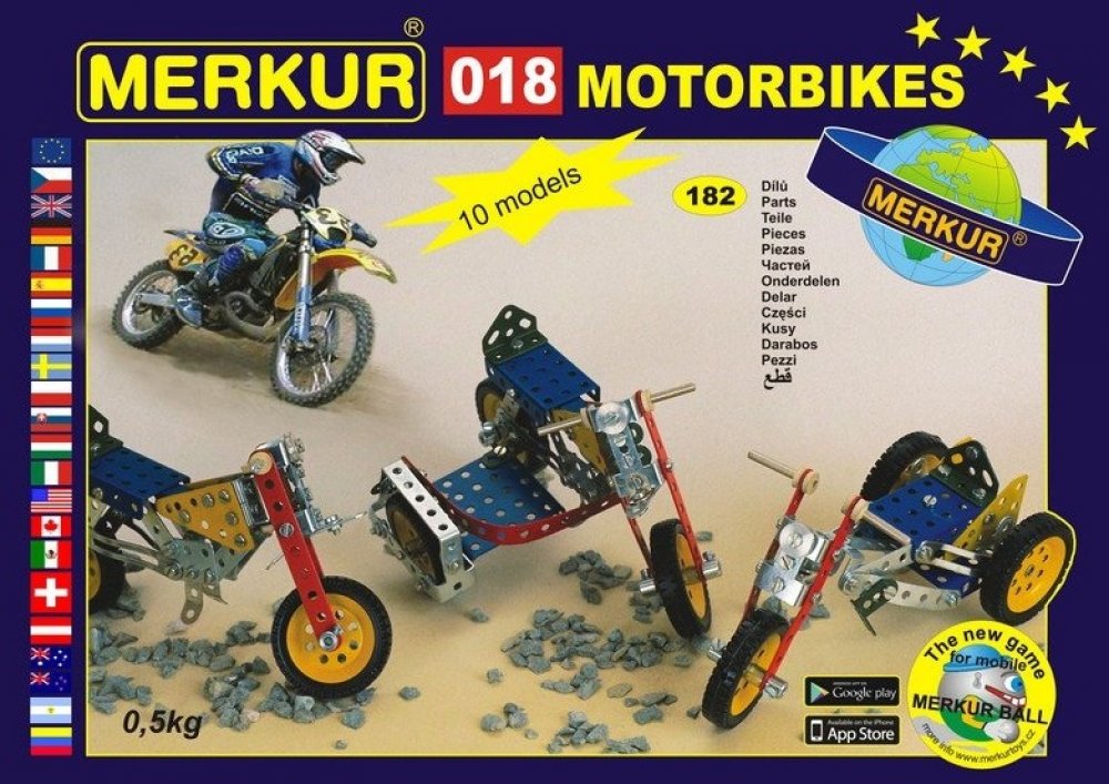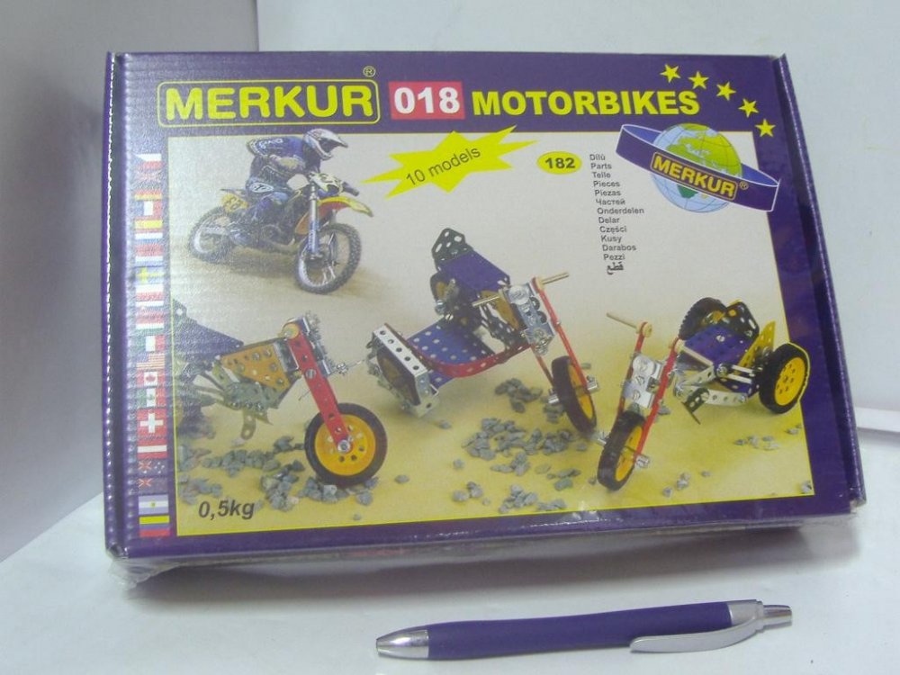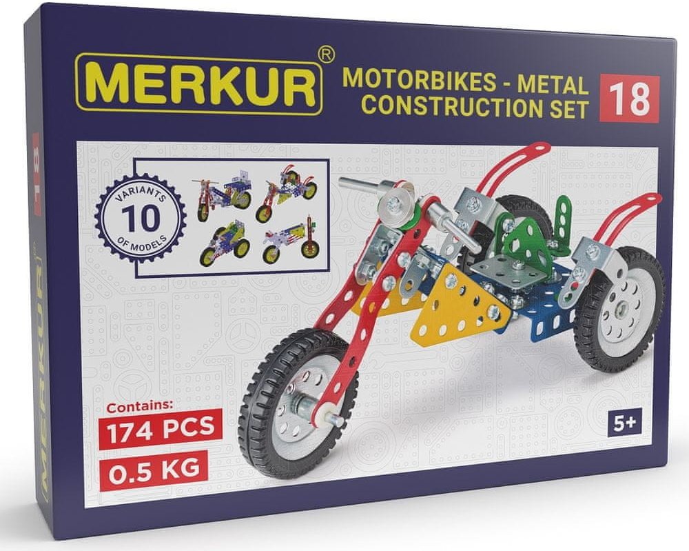 Z této jednovrstvé stavebnice Merkur 018 Motocykly lze dle návodu sestavit až 10 různých modelů terénních motocyklů. Malí konstruktéři mohou sestavit i model dle svých představ, fantazii se meze nekladou. Stavebnice obsahuje 182 dílků. Vhodné i pro děti, které s Merkurem začínají. Se sestavenými modely si lze hrát, jsou velmi odolné. Počet dílků: 182 ks. Rozměr balení: 25,5 x 18 x 5 cm. Věk: 6+. N...