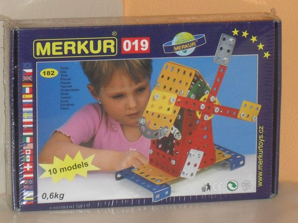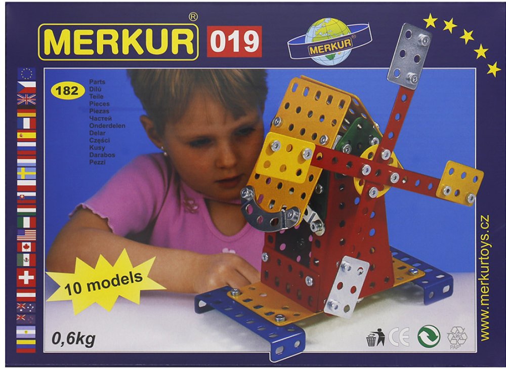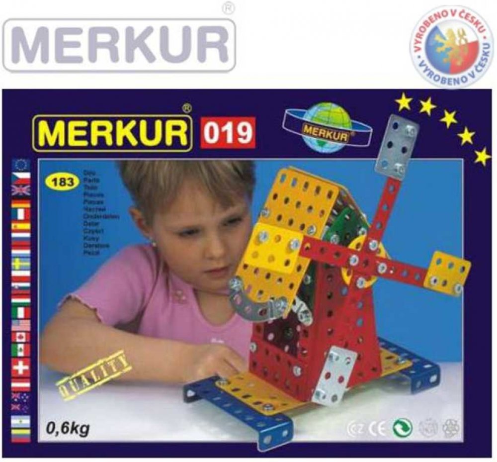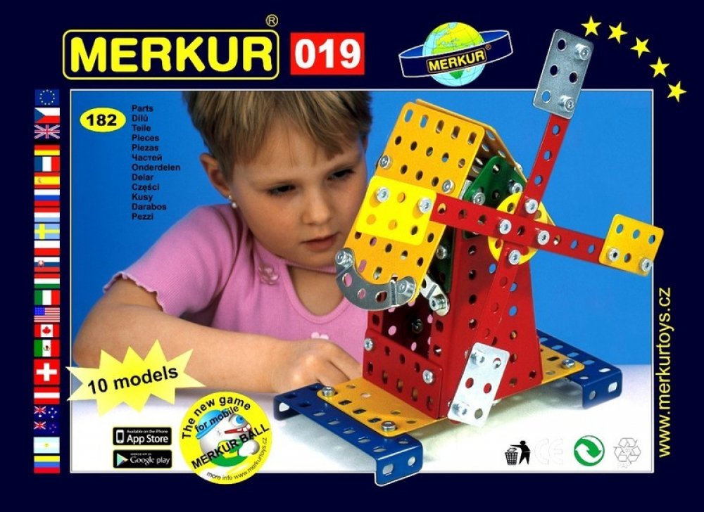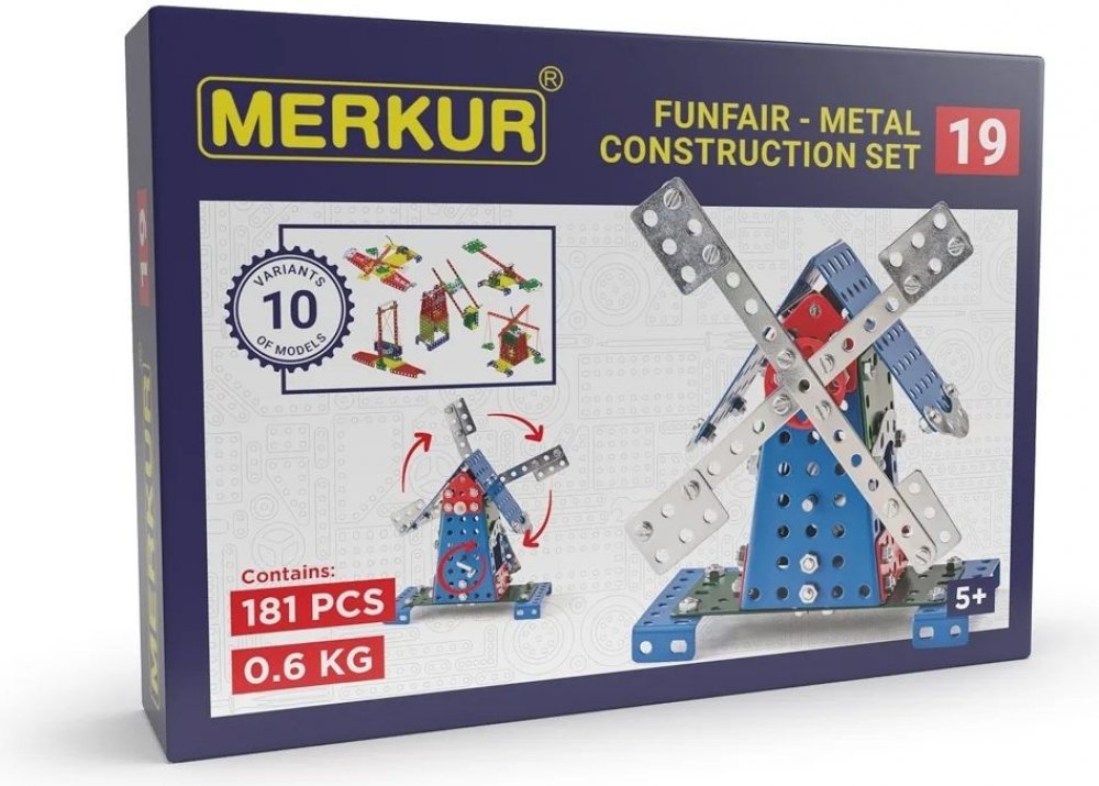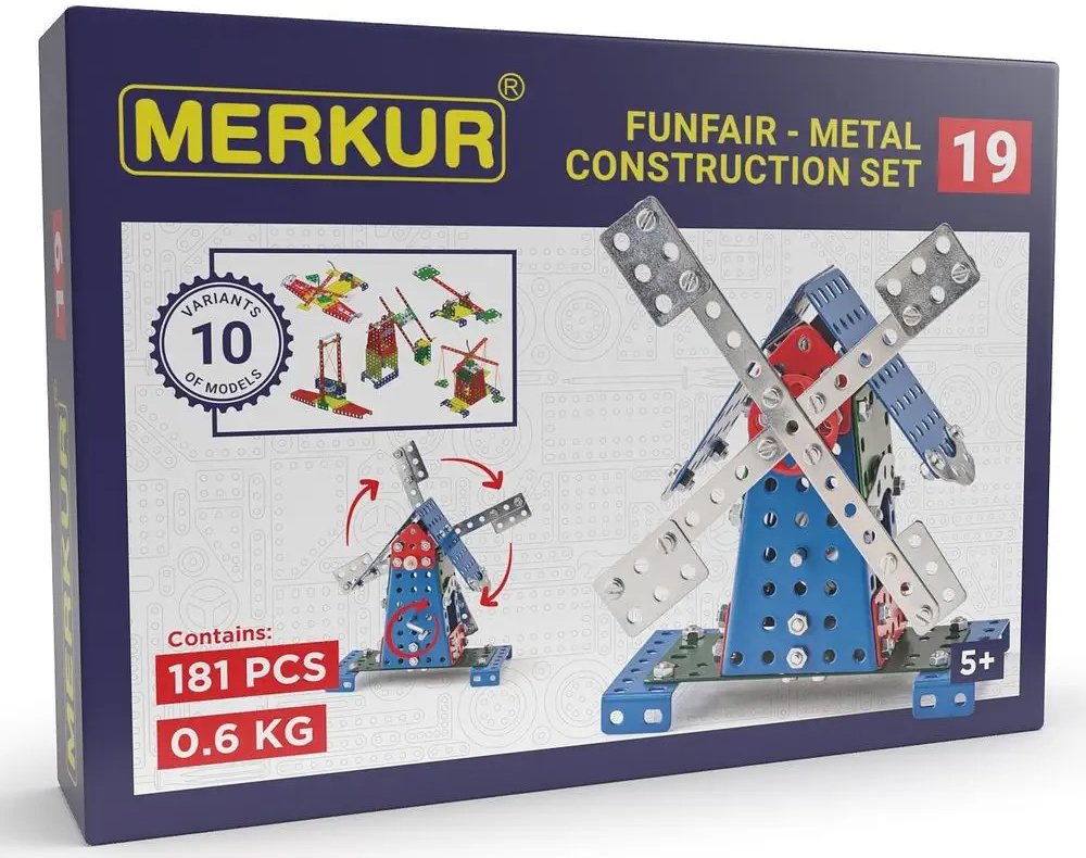 Ze stavebnice Merkur 019 Mlýn je možné dle návodu sestavit až 10 různých modelů pouťových atrakcí. Malí konstruktéři mohou sestavit i model dle svých představ, fantazii se meze nekladou. Stavebnice obsahuje 182 dílků. Vhodné i pro děti, které s Merkurem začínají. Se sestavenými modely si lze hrát, jsou velmi odolné. Rozměr balení: 26 x 18 x 5 cm. Věk: 6+. Nevhodné pro děti mladší 3 let.