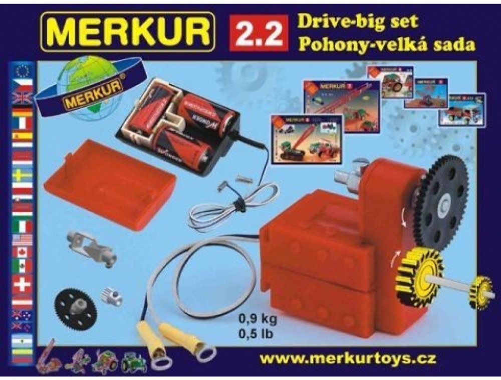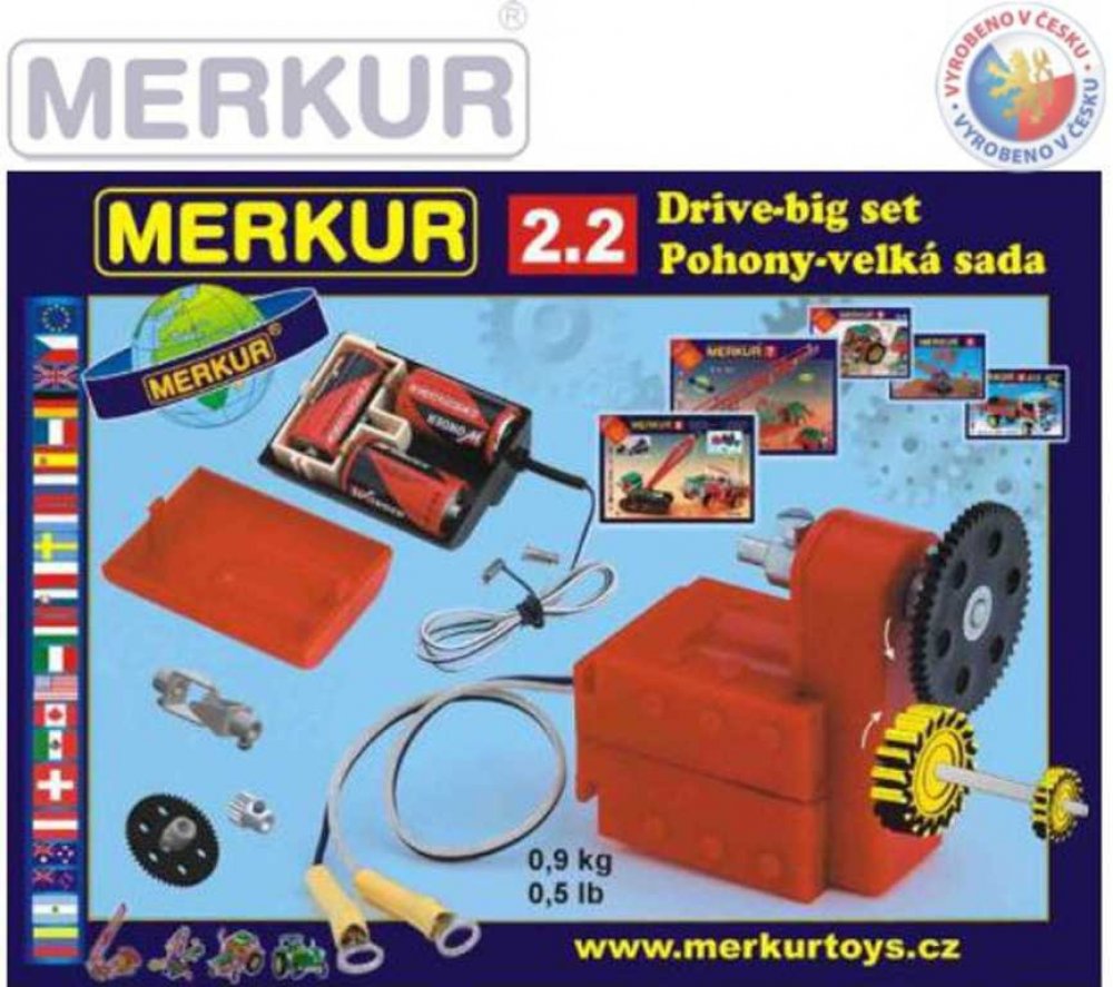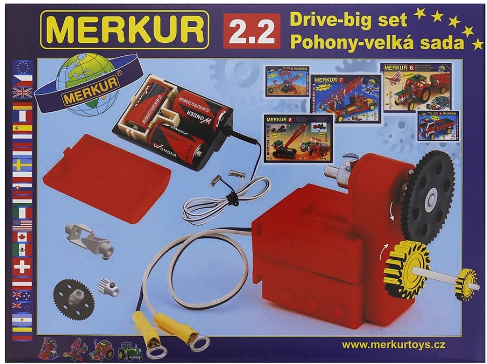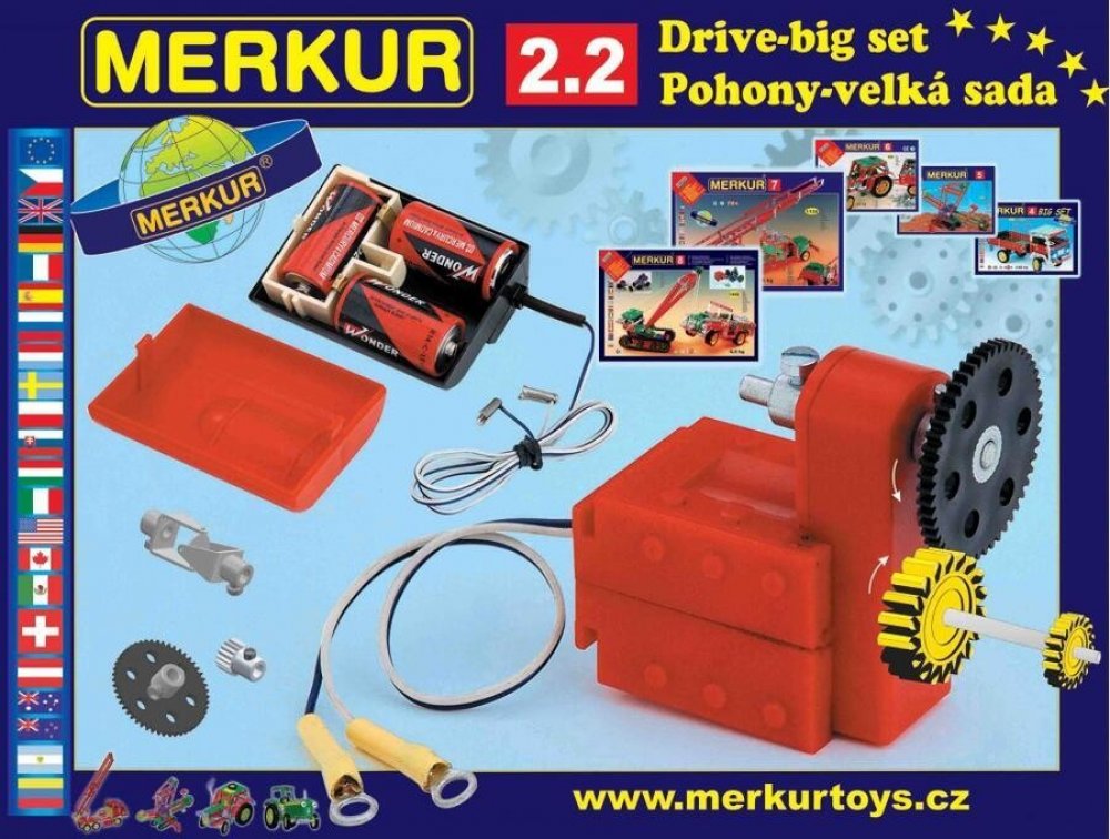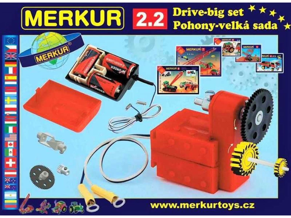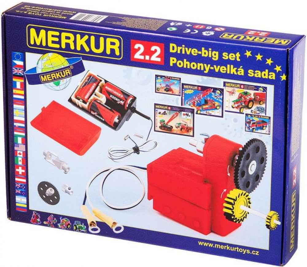 Stavebnice Merkur M 2.2 Pohony a převody - ideální doplněk ke všem větším stavebnicím , umožňující rozpohybovat postavené modely. Podrobný popis:Ideální doplněk ke všem větším stavebnicím umožňující rozpohybovat postavené modely. Obsahuje elektrický motorek s dvoustupňovou převodovkou, ovládací pouzdro na baterie a rozšířenou sadu ozubených koleček. Napájecí pouzdro je určeno pro 3 monočlánky typu C (nejsou součástí dodávky). Motorek má 2 stupně rychlosti : 180 ot./min a 1120 ot./min.
