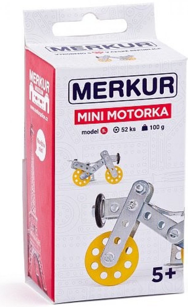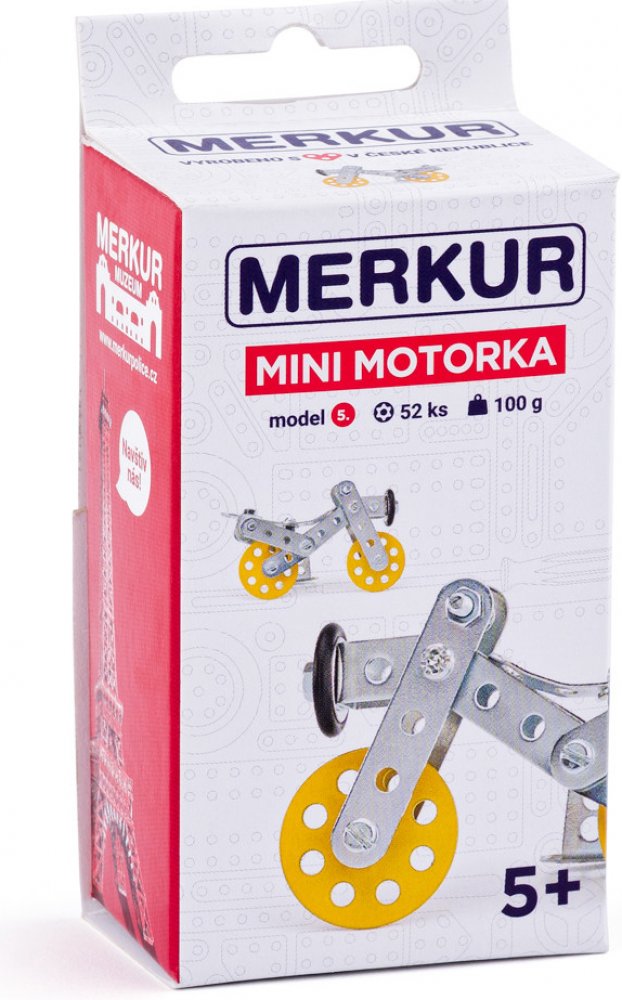 Startovací mini stavebnice Merkur, z které je možné sestavit 1 model - motorku. Ideální pro trénink jemné motoriky a představivost. Vhodné i pro děti, které s Merkurem začínají, ale také pro sběratele.