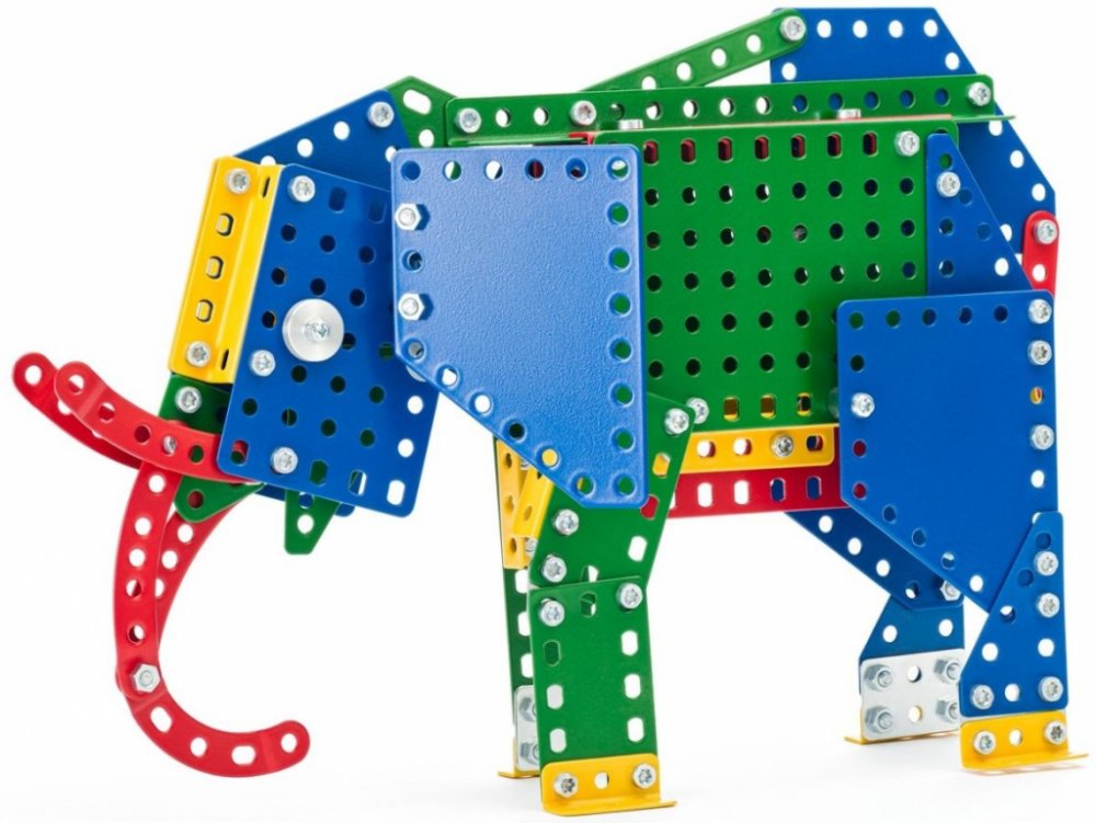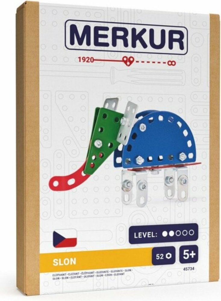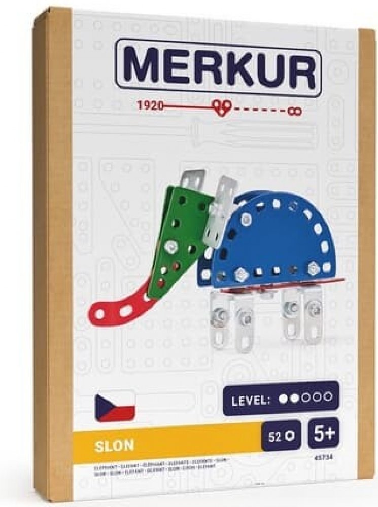 Merkur Slon - jedná se o stavebnici s jejíž pomocí si je možné dle návodu sestavit zvířátko. Tato jedinečná sada je ideálním nástrojem pro rozvoj technických dovedností a představivosti dětí. Stavebnice obsahuje kvalitní kovové díly, které se snadno spojují šroubky, což podporuje rozvoj jemné motoriky, logického myšlení a soustředění.