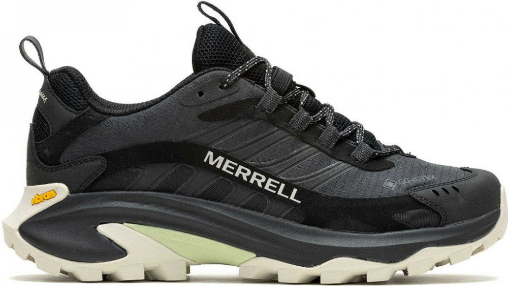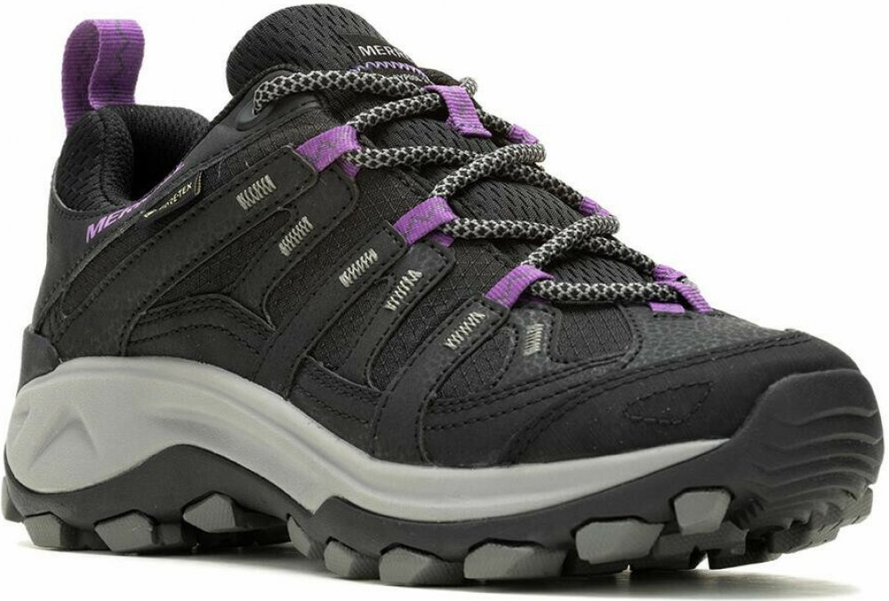 Lehká dámská nízká nepromokavá treková obuv. Svršek je kombinací syntetické kůže a mesh, membrána Gore-tex, gumová podešev Merrell, Merrell Air Cushion tlumení v patní části, ochrana proti okopu, podpora klenby. Ošetřeno NXT ochranou pro zamezení vzniku nepříjemného zápachu. Barva černá v kombinaci s šedou a fialovou.