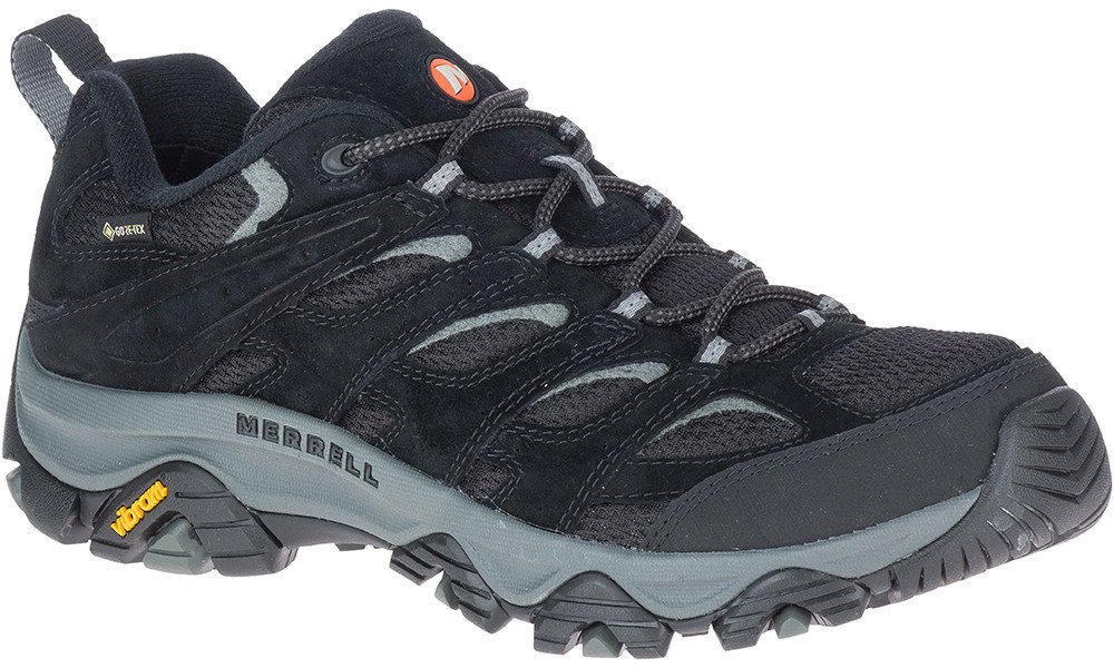 Merrell nízké kůže 920.0 g Gore-Tex na středně náročný terén na jednodenní turistiku černá tenisky Moab 3 Gore-Tex, Vibram TC5+ celoroční na šněrování s vyjímatelnou stélkou standardní šířka s plnou výbavou na středně náročnou turistiku s žádnou kompatibilitou pro mačky s měkkou podešví s obsázkou na špičce EVA Vibram s výstuhou u prstů 5 mm