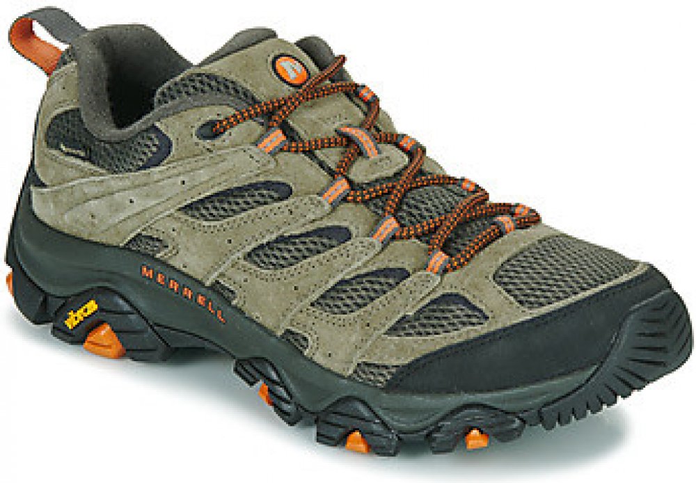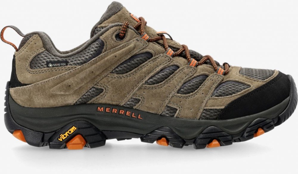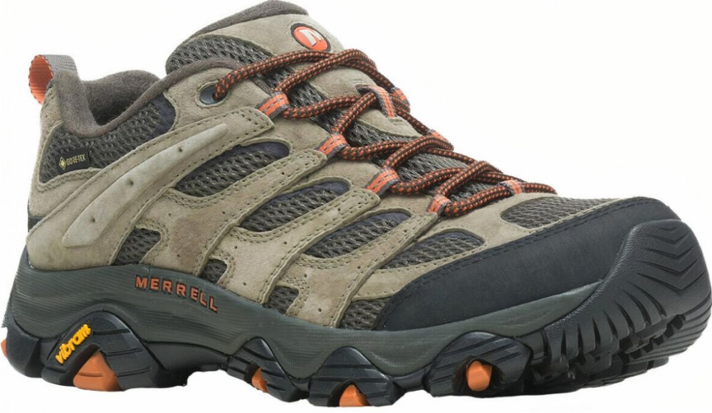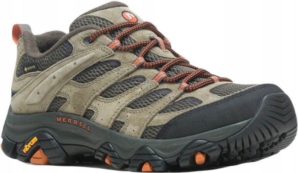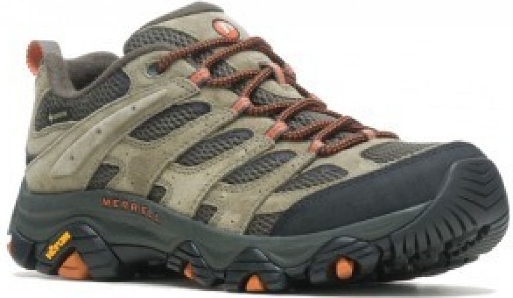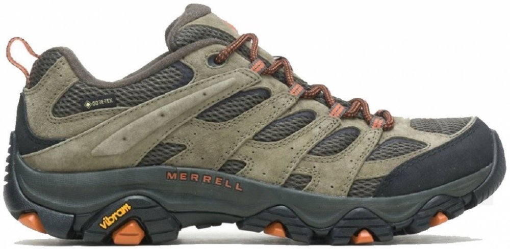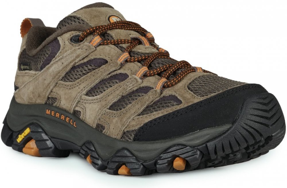 Merrell nízké semiš 862 g Gore-Tex na středně náročný terén na jednodenní turistiku khaki pohorky Moab 3 Gore-Tex, Vibram TC5+ jarní/letní/podzimní na šněrování standardní šířka se střední výbavou na středně náročnou turistiku se středně tuhou podešví 5.0 mm s obsázkou na špičce a patě ostatní pěnové technologie Vibram 11 mm