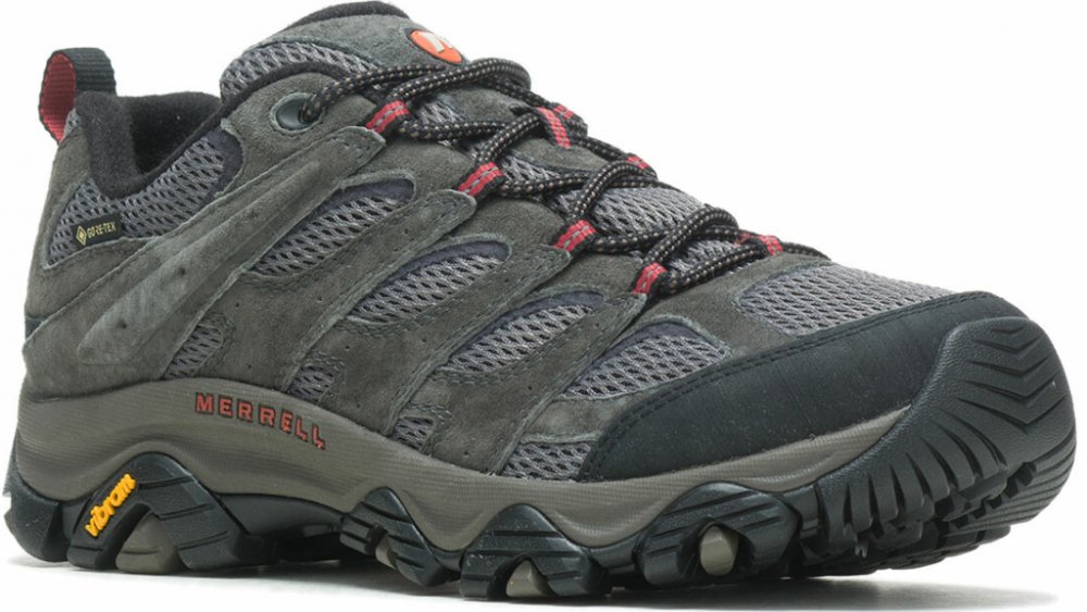 Merrell nízké semiš 852.0 g Gore-Tex na středně náročný terén na jednodenní turistiku šedá pohorky Moab 3 Merrell Air Cushion, Super Rebound Compound jarní/letní/podzimní na šněrování standardní šířka s plnou výbavou na středně náročnou turistiku s žádnou kompatibilitou pro mačky se středně tuhou podešví 5.0 mm s obsázkou na špičce ostatní pěnové technologie Vibram 11 mm