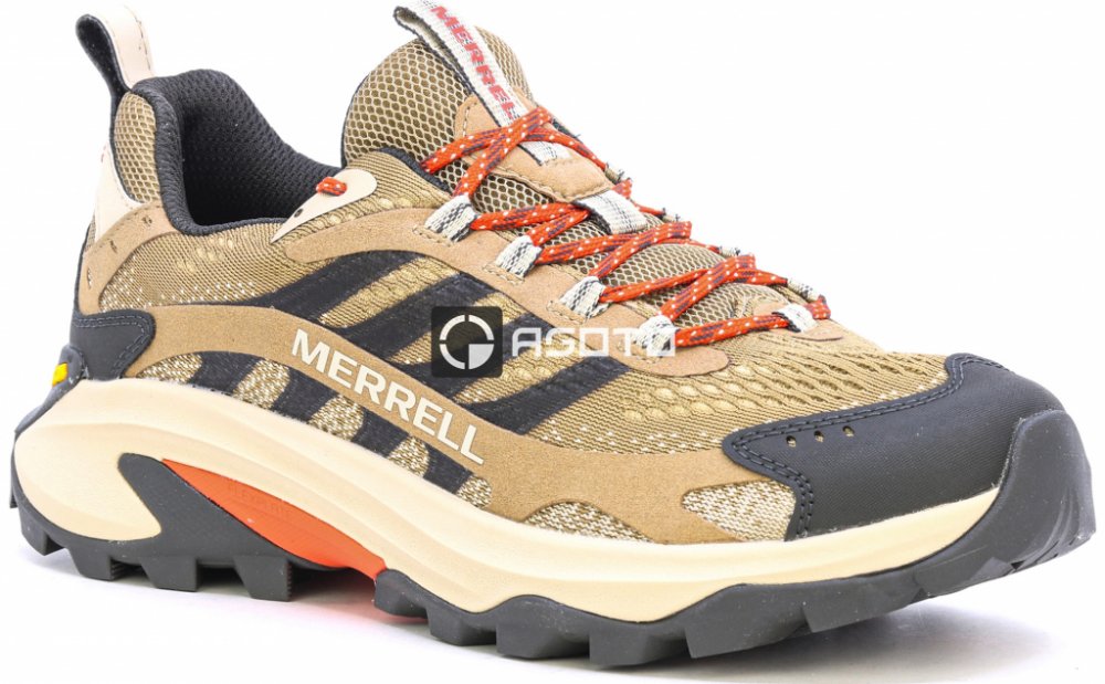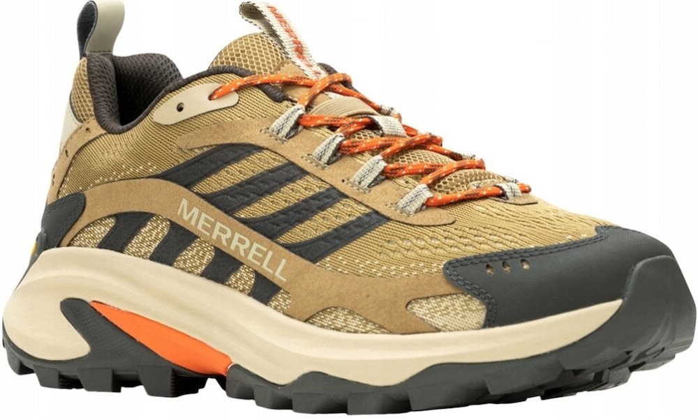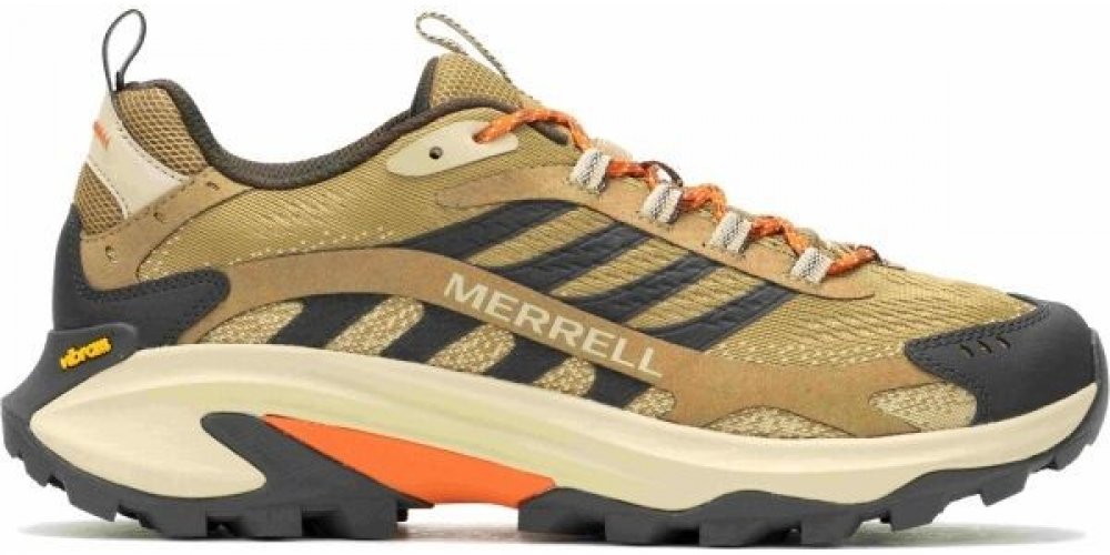 Trekingová obuv Merrell MOAB Speed 2 v barvě Coyote je nízká obuv vyrobená z kombinace TPU a odolného materiálu v Rip-Stop vazbě. Část svršku, vložky a recyklované šněrovací pásky zajišťují prodyšnost. Vynikající jak na stezce, tak jako městské boty.