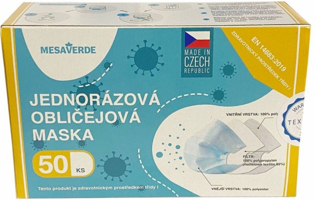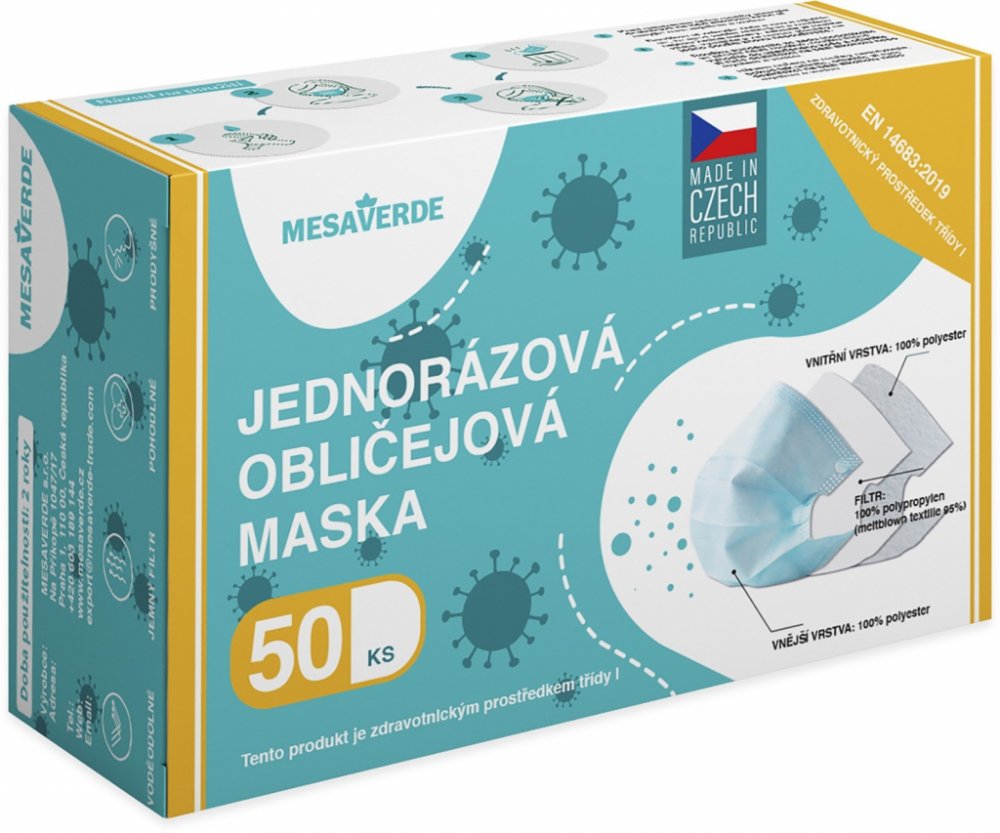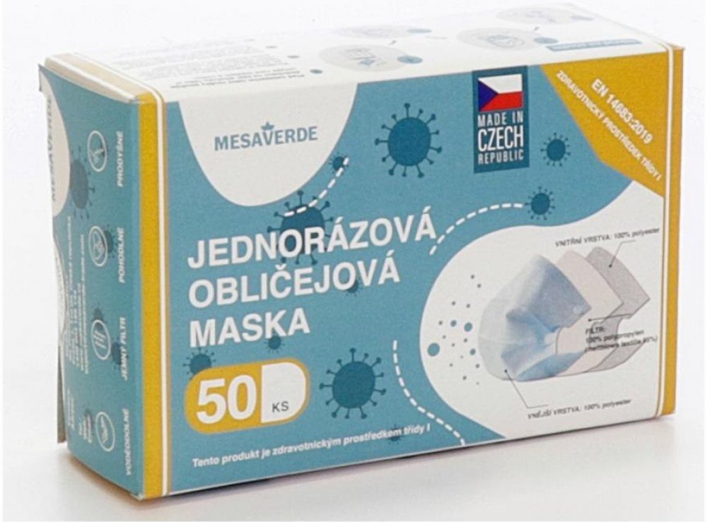 Balení obsahuje 50 kusů jednorázových roušek Mesaverde.