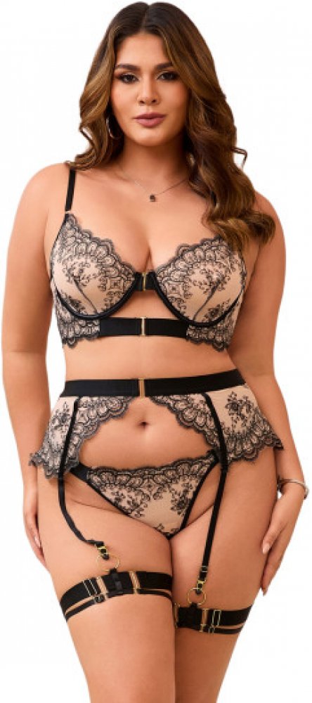 Set podprsenky s podvazky je vyroben z lehké a prodyšné síťoviny (95 % polyester, 5 % spandex/elastan), která je měkká a pohodlná na nošení. Podprsenka je vybavena ocelovými kroužky a zapínáním na zadní řadě háčků, což poskytuje vynikající oporu a tvarování poprsí. Jemná krajková 3D výšivka s květinovým motivem zdobí všechny tři části setu – podprsenku, podvazkový pás a kalhotky. Nastavitelné podv...