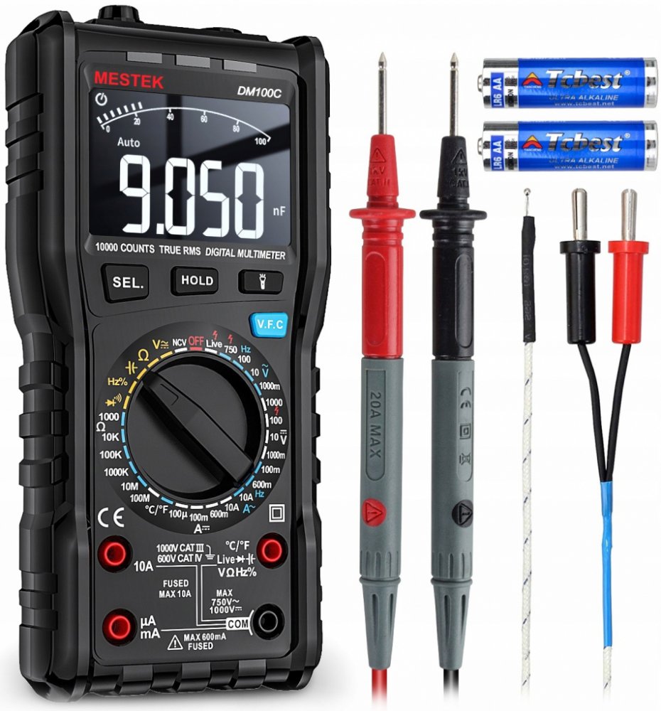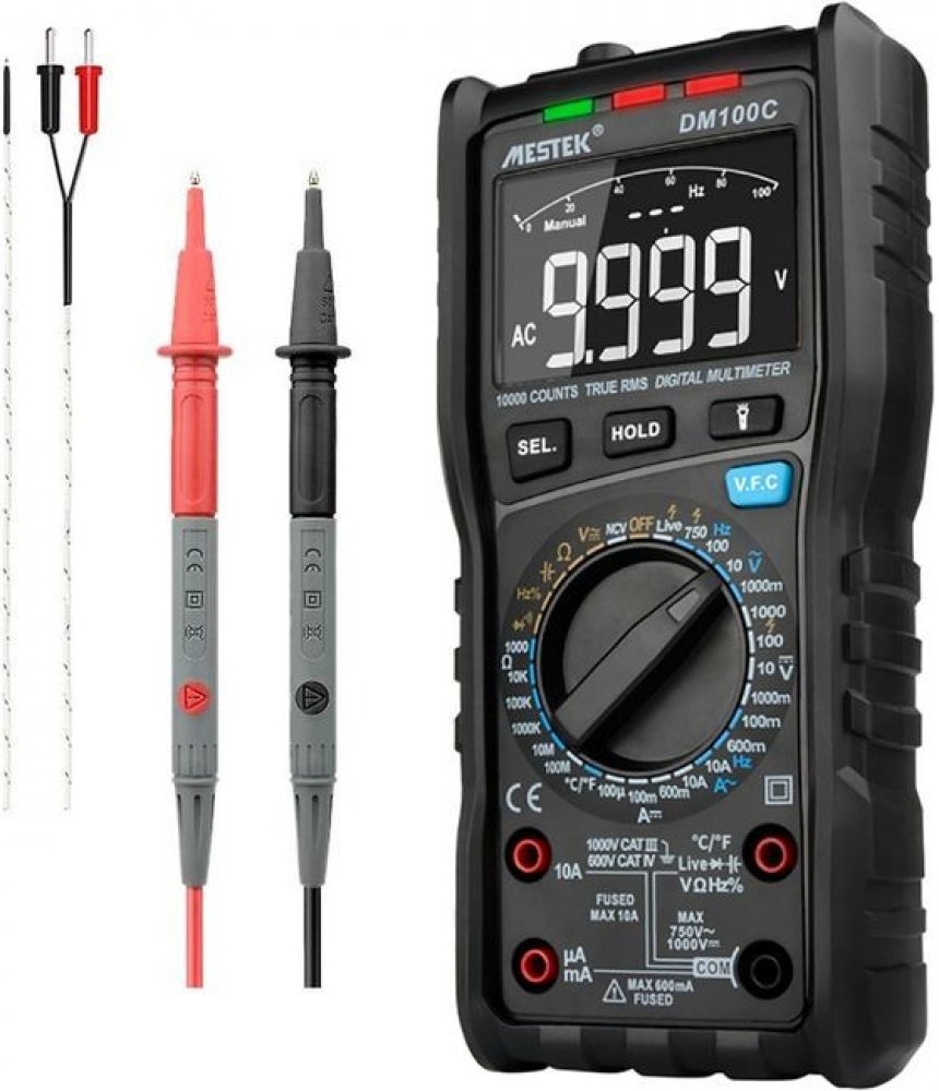 - Digitální multimetr AC/DC, AC/DC, Ohm, Hz, nF, pracovního cyklu, vlhkosti, teploty, diod, testování vodičů pod napětím, kontinuity obvodu, funkcí NCV a VFC