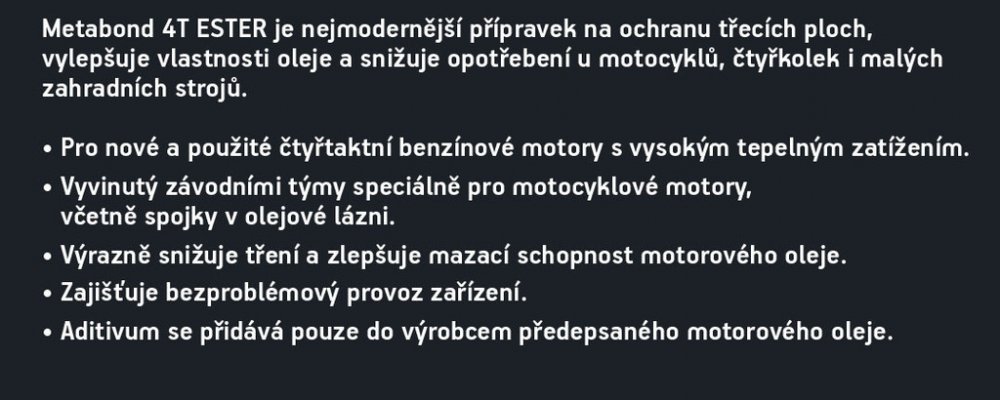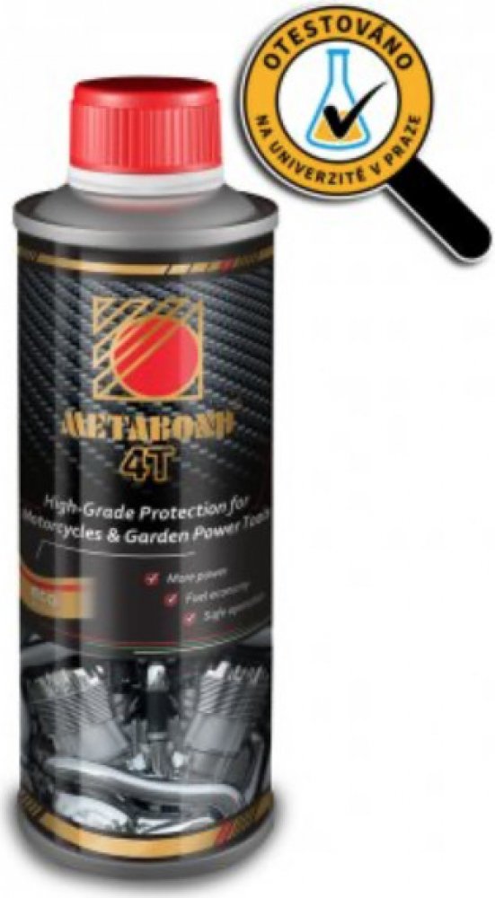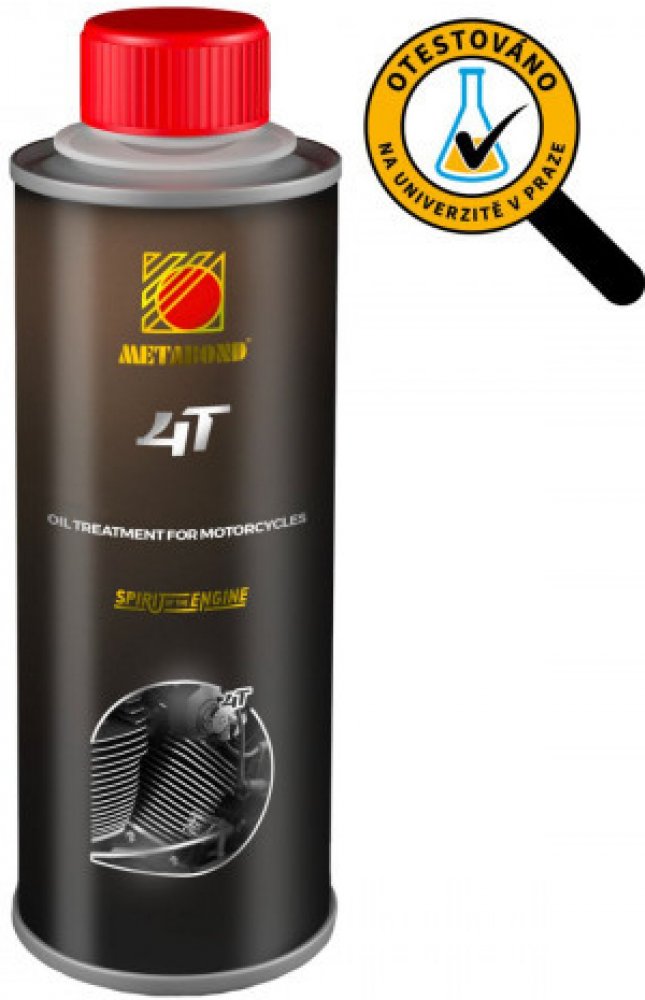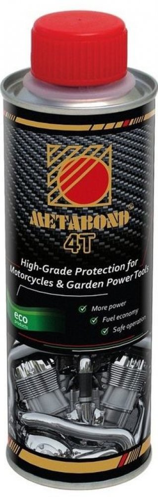 Metabond 4T Racing je nejmodernější zušlechťovač kovových povrchů bez popela určený pro čtyřtaktní motocyklové motory. Vyvinutý závodními týmy speciálně pro motocyklové motory.Výrazně snižuje tření a zlepšuje mazací schopnost motorového oleje. Je určený do nových i použitých čtyřtaktních zážehových motorů v motocyklech a čtyřkolkách. Přidává se pouze do výrobcem předepsaného motorového oleje.