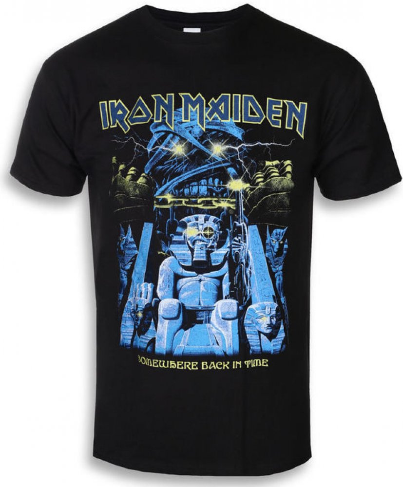 Tričko metal ROCK OFF Iron Maiden Back In Time Mummy černá pánské tričko s předním potiskem.