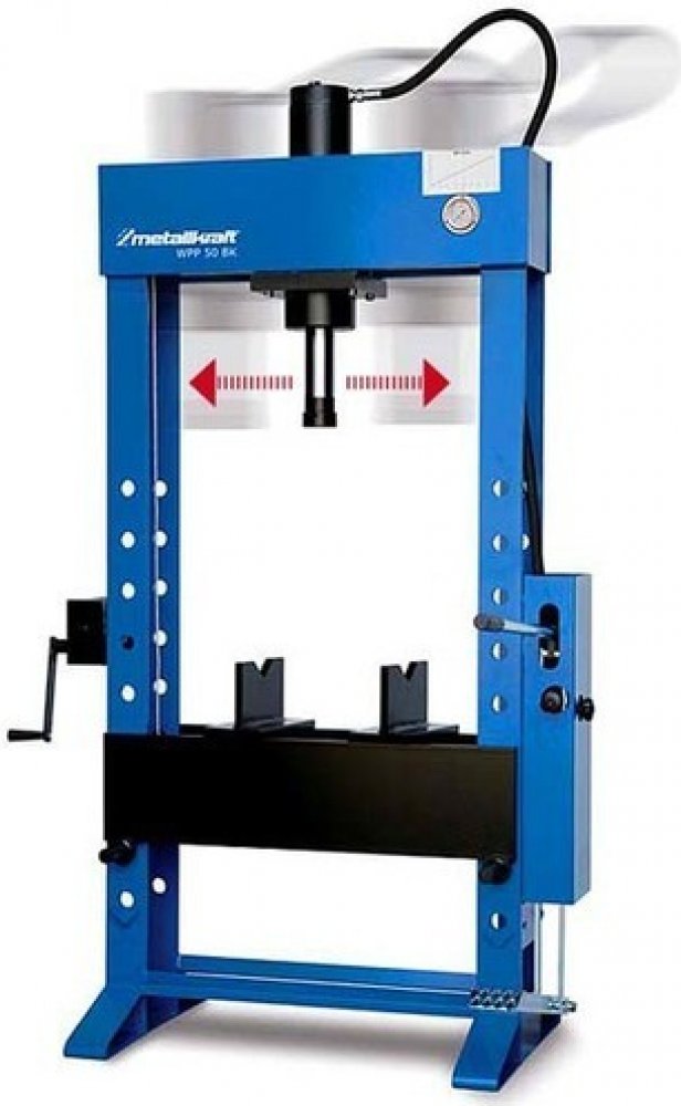 Cenově výhodný stroj pro servis, mechanické a opravárenské dílny atd. Dvourychlostní lis – při chodu naprázdno se píst pohybuje rychle, při zatížení se automaticky přepne na nižší rychlost. Možnost posuvu hydraulického válce po horní konstrukci lisu do požadované polohy. Prizmatické podpěry jsou součástí dodávky. Pojistný ventil chrání lis proti přetížení. Ukazatel tlaku válce. Spolehlivá hydrauli...