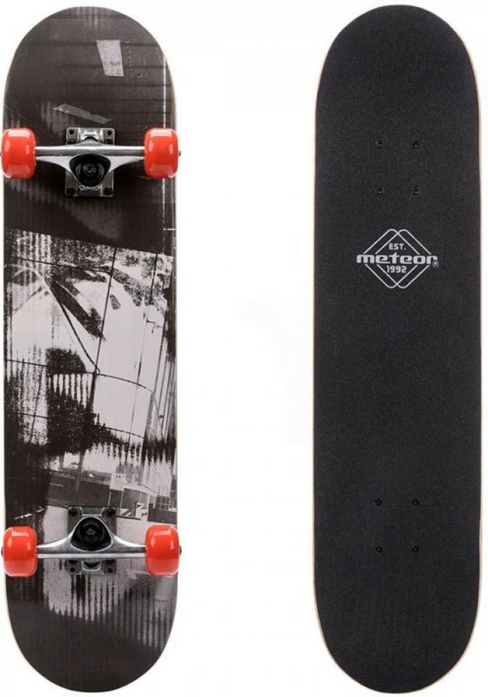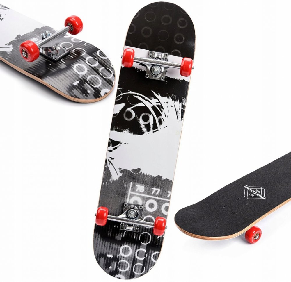 Skateboard Meteor Wooden Black - povedený skateboard vhodný pro děti a začátečníky pro nácvik základních triků. Skateboard Meteor Wooden Black - povedený skateboard vhodný pro děti a začátečníky pro nácvik základních triků.Skateboard je vhodný pro klasickou jízdu po zpevněném povrchu (chodníky, stesky, betonové plochy ) a pro nácvik základních triků. Konkávní deska s double kickem je vyrobena z 9ti vrstev čínského javoru a je dostatečně pevná a odolná pro danou kategorii skateboardů pro začátečníky. Vysoká tvrdost koleček v kombinaci s ložisky abec 5 zaručuje dostatečnou rychlost a reakci. Nedoporučuje se používat na U-rampě pro skoky, grindy a jízdu na větších překážkách. Povedený skateboard vhodný pro děti a začátečníky pro nácvik základních triků
