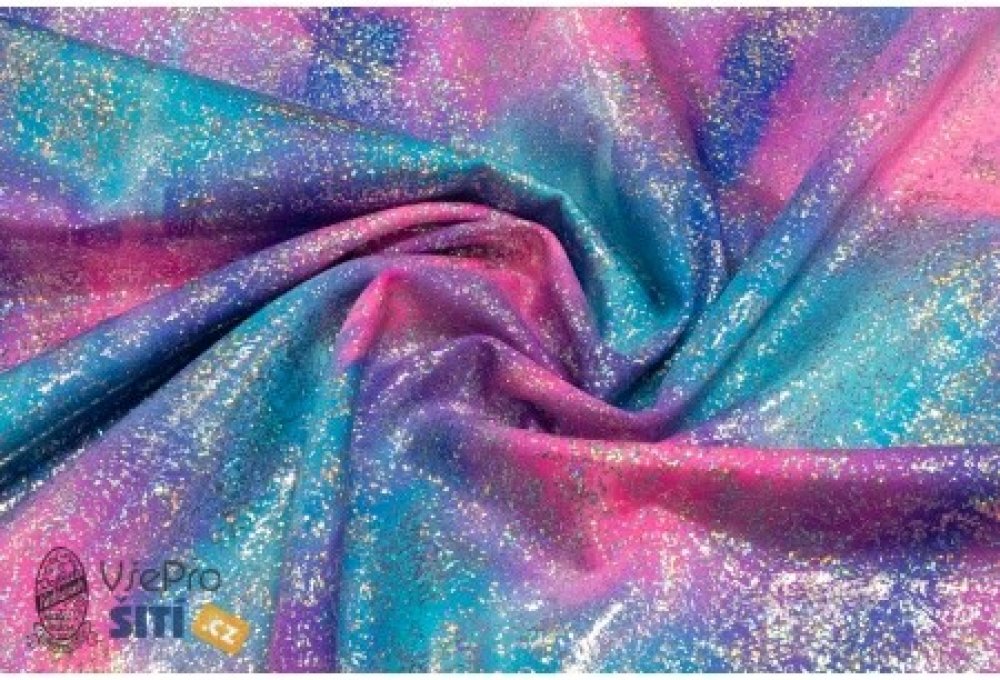 - elastická látka s metalickým leskem vhodná na taneční kostýmy, plavky apod. v tyrkysovo- růžové barvě se stříbrným nástřikem - šíře: 145 cm