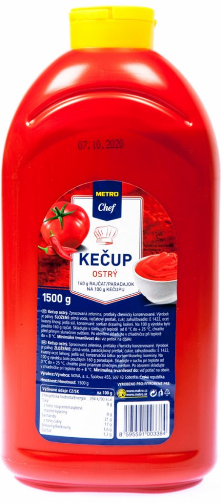 ZÁKONNÝ NÁZEV POTRAVINYMC kečup ostrý 1,5 kgSLOŽENÍVoda, rajčatový protlak, cukr, modifikovaný škrob E 1422, ocet kvasný, jedlá sůl, konzervant sorbát draselný, koření.100g výrobku obsahuje 160g rajčat.ALERGENYNeuvádí se, MŮŽE OBSAHOVAT: Neuvádí seVÝŽIVOVÉ ÚDAJE/JEDNOTKA394 kJ / 93 kcal na 100 g výrobkuVÝŽIVOVÉ ÚDAJE/PORCE39,4 kJ / 9,3 kcal na 10 g výrobku, na p