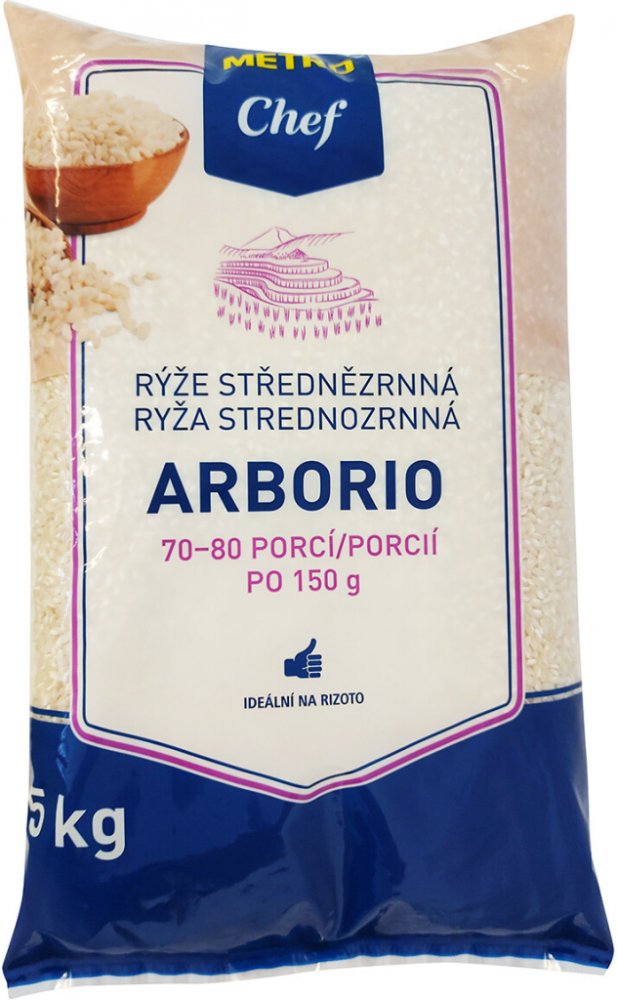 -- METRO Chef Rýže Arborio 5 kg.Návod na přípravu:Rýži několikrát propláchněte horkou vodou a vsypte do vroucí osolené vody s troškou oleje. Vařte cca 0-23 minut, případnou přebytečnou vodu sceďte a rýži servírujte.O značce:Vařte jako šéfkuchař…