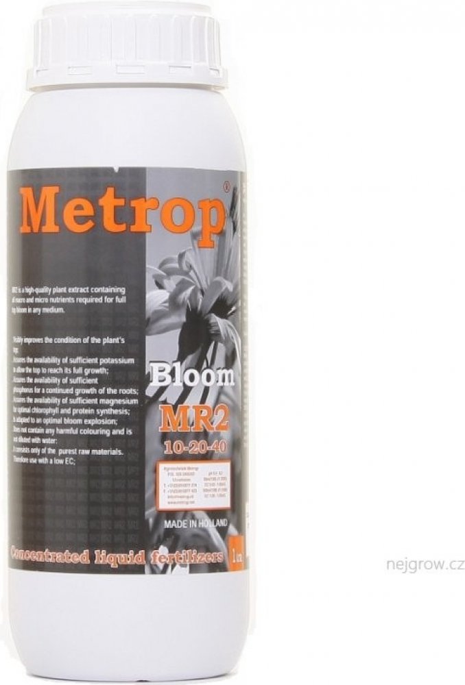 Metrop MR2 je květové hnojivo N-P-K 10-20-40. U Metrop Hydroponic MR2 biominerální hnojivo pro květ je poměr N-P-K a množství stopových prvku nastaveno na maximální výnos rostlin. Základní látky pro Metrop MR2 biominerální hnojivo pro květ jsou obzvlášte čisté, čímž se zvýší podíly N-P-K, aniž by docházelo k poškození rostlin