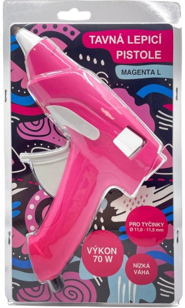 Lepicí pistole MAGENTA L, 70 W, O 11 - 11,5 mm, MAGENTA S, 25 W, O 7 - 7,5 mmHorká lepicí pistole je přenosné ruční zařízení, které slouží k roztavení tuhého lepidla a jeho mechanickému nanesení pomocí hrotu nebo krátké kuličky na lepené nebo fixované plochy. Pistole se skládá z tavné komory, která je zahřívána na konstantní teplotu elektrickým topným článkem. Pistole je vybavena podávacím zařízením, kterým se tyčinka zasouvá do tavné komory. Tyč se do tavicí komory posouvá stisknutím spouště. Otvor slouží k vložení tyčinky tavného lepidla.