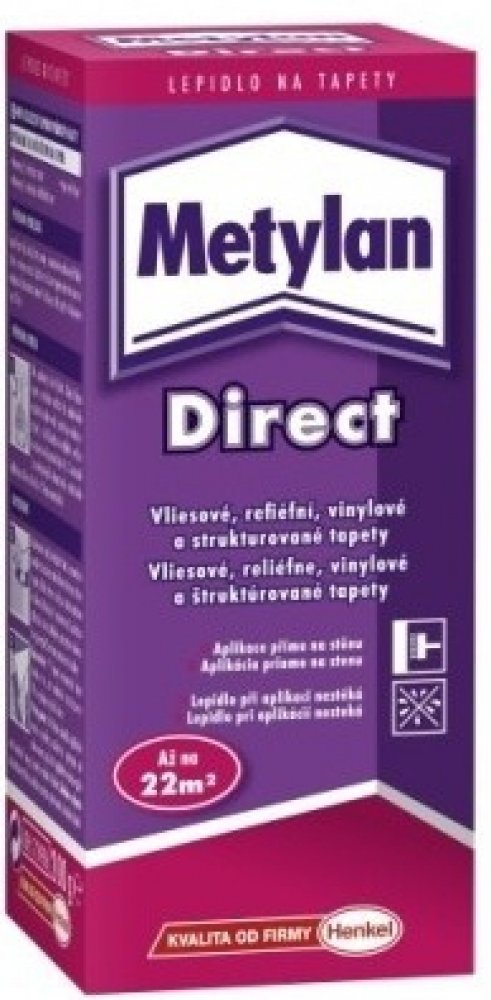 Metylan Direct - se speciální přísadou pro čisté a spolehlivé tapetování - při nanášení přímo na stěnu lepidlo nestéká - můžete ho nanášet válečkem přímo na stěnu - vysoká počáteční přilnavost s dobrou možností dodatečné opravy (lepí ihned, ale tapety lze ještě mírně posouvat) - pro použití je připraveno do 3–5 minut - optimální lepicí síla - vysoce odolné proti vlhkosti - umožňuje odstranění kvalitních netkaných textilních tapet zasucha - dá se snadno míchat i nanášet - rovnoměrná (homogenní) konzistence - odolné proti vysoké teplotě, vápnu a cementu - vhodné k tapetování i pomocí tapetovacích zařízení Vhodné na lepení: - vliesových tapet - netkaných textilních tapet – s hladkou i hrubou rubovou stranou Balení: 200 g