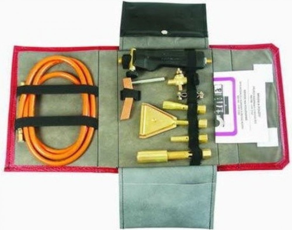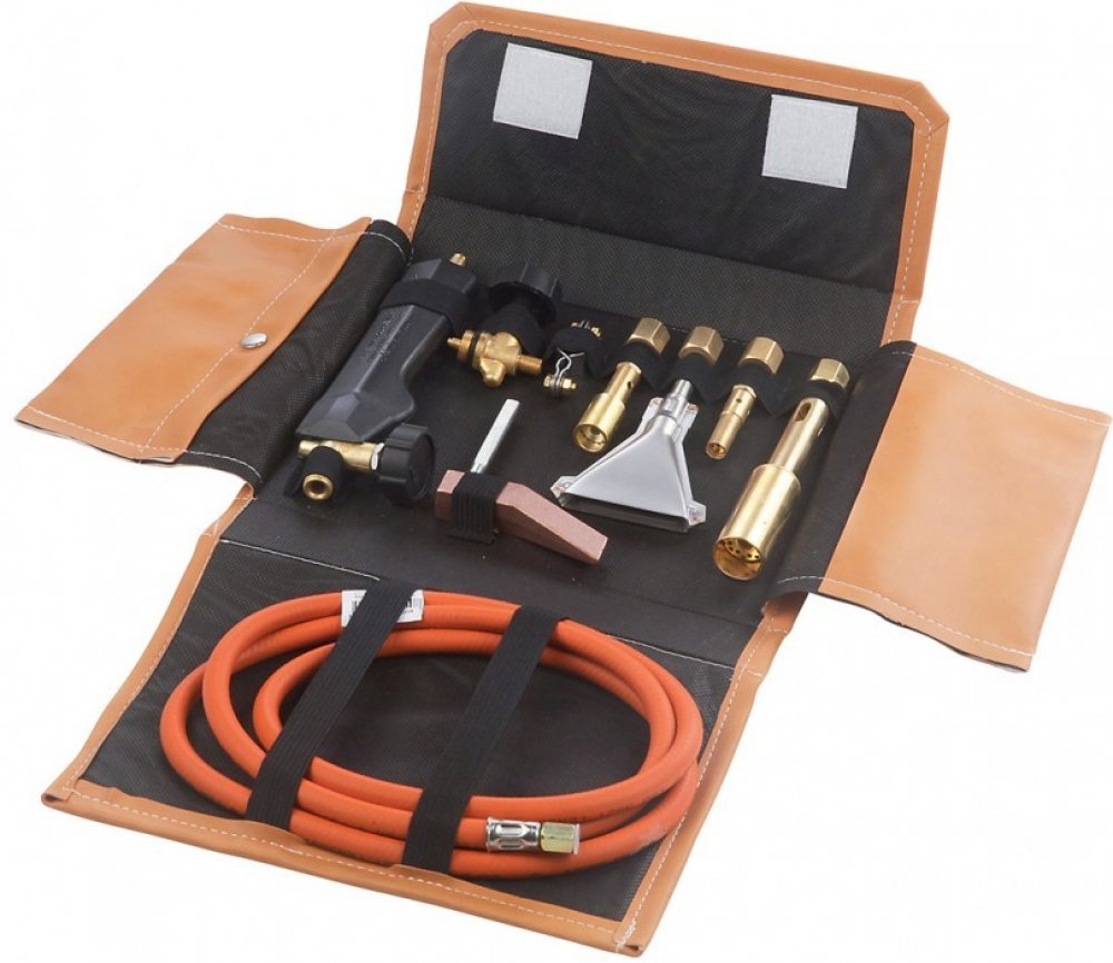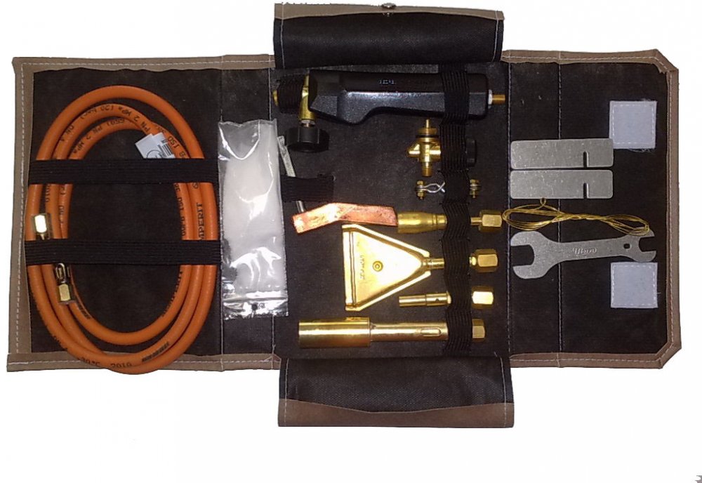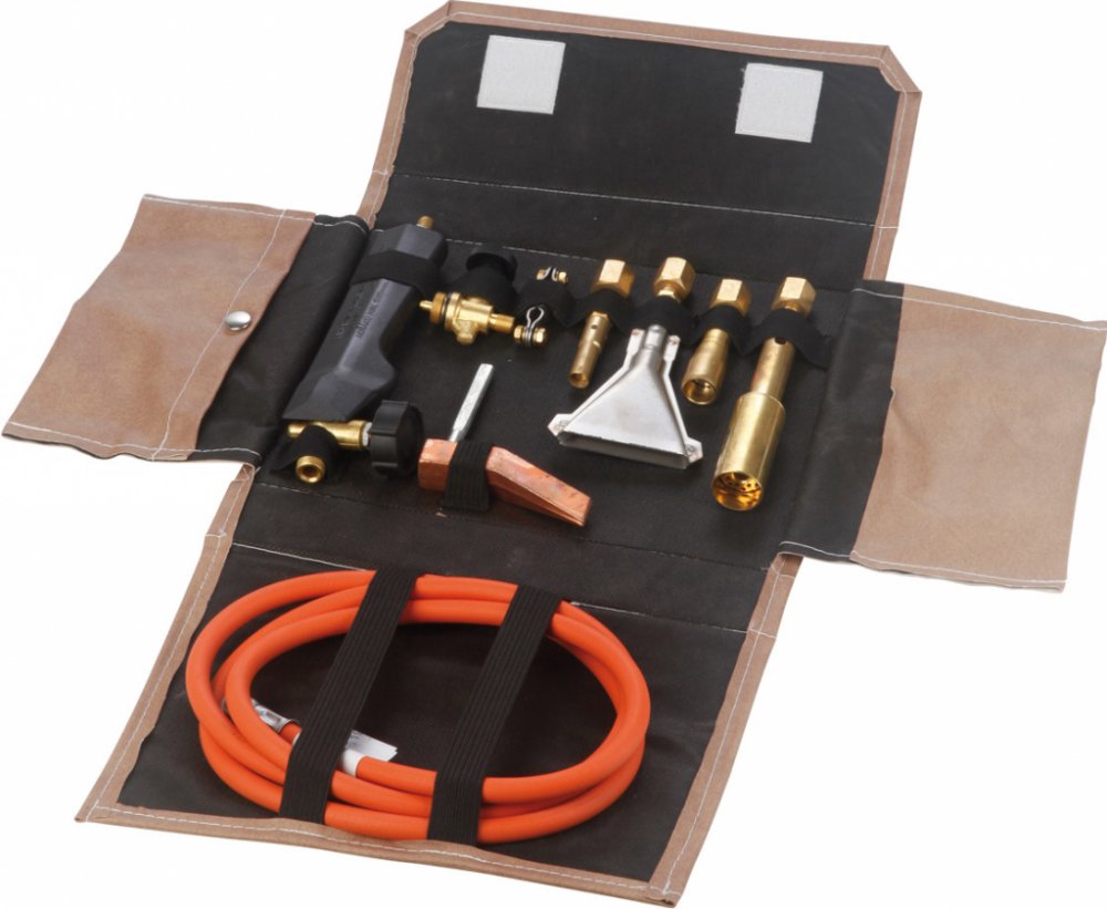 Komplet obsahuje: 4x vyměnitelné hořáky - opalovací a pájecí, rukojeť hořáku, pájedlo, hadici, ventil pro připojení 2 kg propan butanové láhve, textilní brašna
